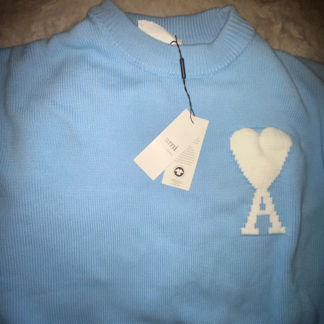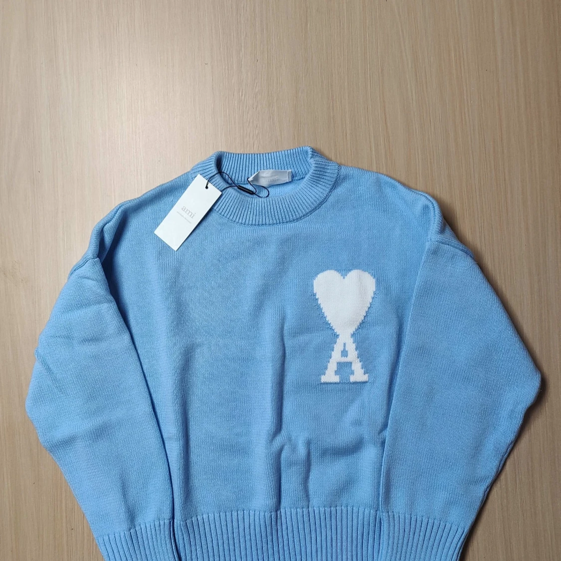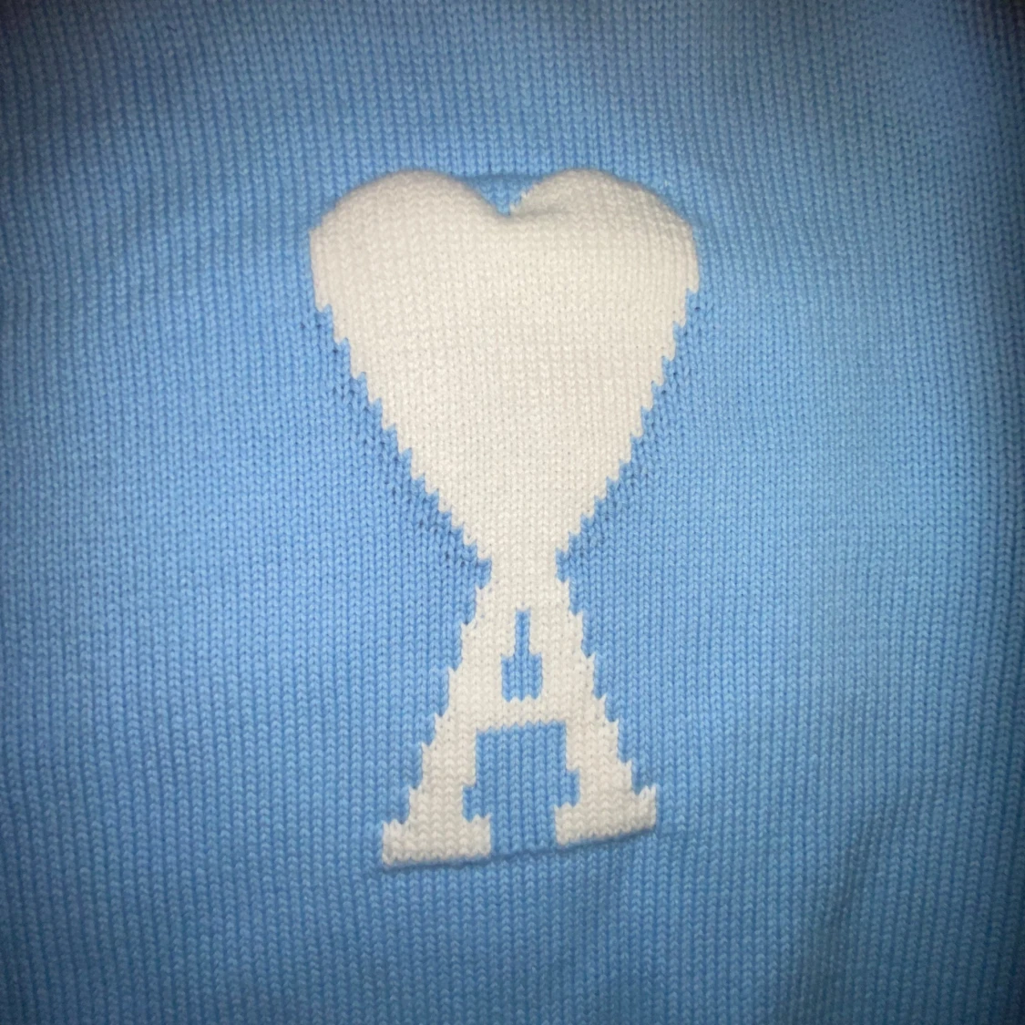 Säljer en snygg ljusblå stickad tröja från Ami med ett vitt hjärta och bokstaven A på bröstet. Tröjan har en klassisk rund hals och långa ärmar. Perfekt för en stilren look.