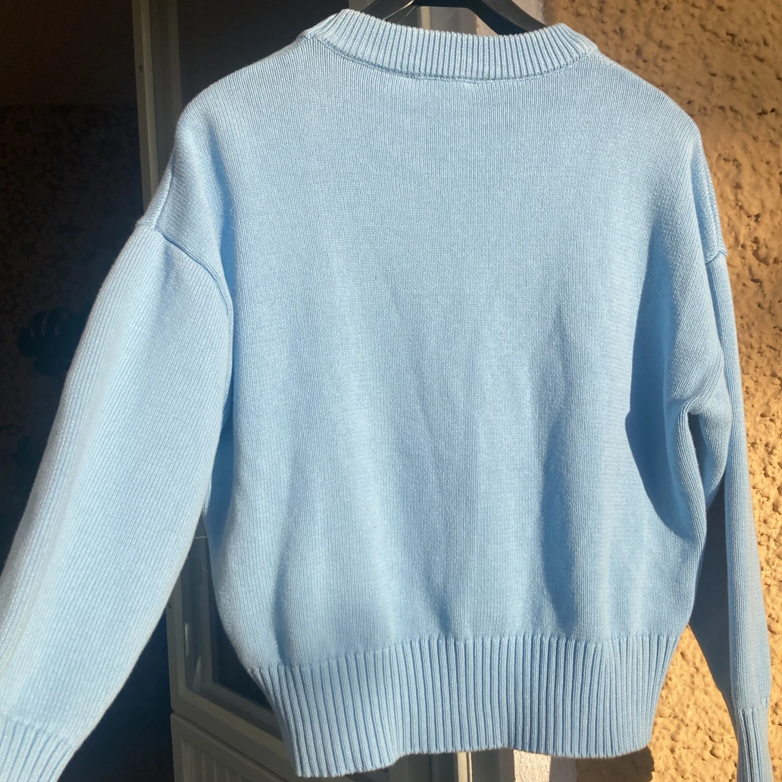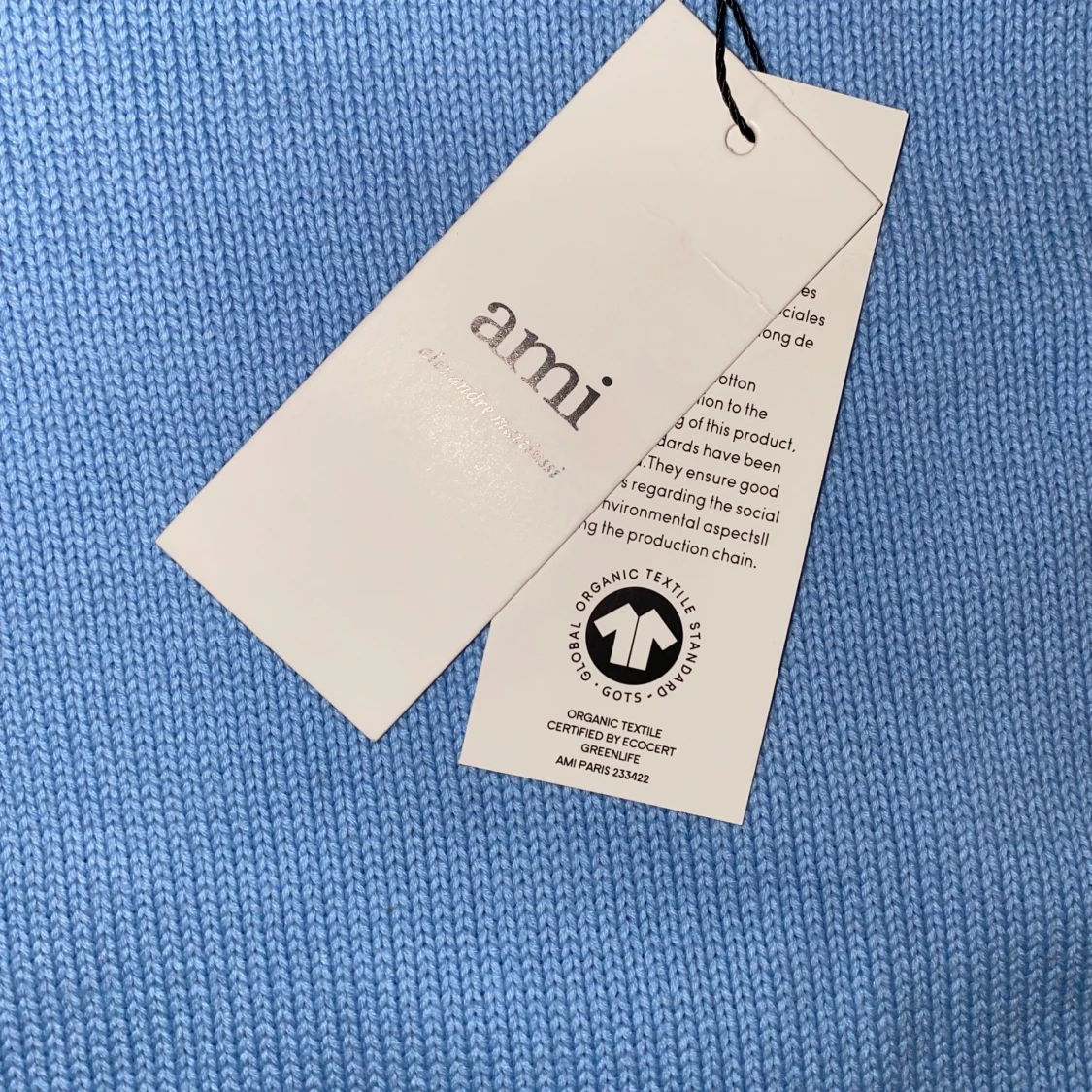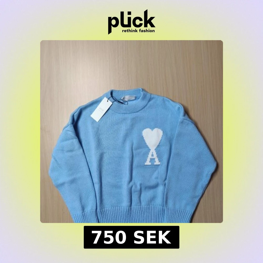 Säljer en snygg ljusblå stickad tröja från Ami med ett vitt hjärta och bokstaven A på bröstet. Tröjan har en klassisk rund hals och långa ärmar. Perfekt för en stilren look.