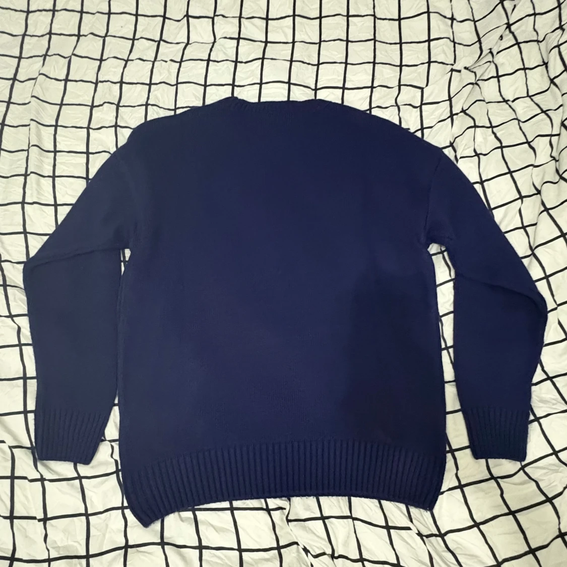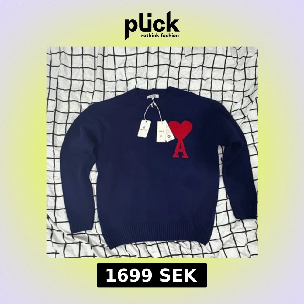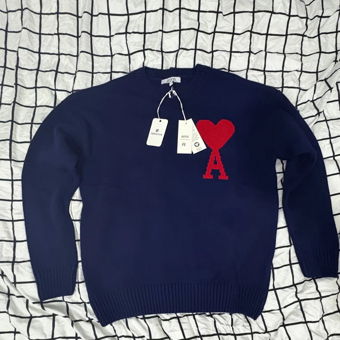 Säljer en mörkblå stickad tröja från Ami Paris med röd hjärt- och A-detalj på bröstet. Tröjan har rund hals, långa ärmar och ribbade muddar. Perfekt för dig som vill ha en stilren look. (Rep)