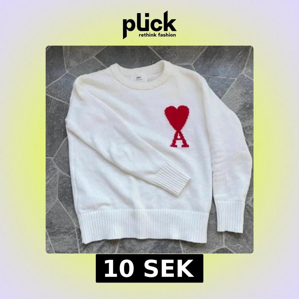 Säljer en vit stickad tröja från Ami med ett stort rött hjärta och bokstaven A på bröstet. Tröjan har rund hals, ribbade muddar och är långärmad. Perfekt för dig som gillar stilrena detaljer och vill sticka ut med ett coolt motiv.