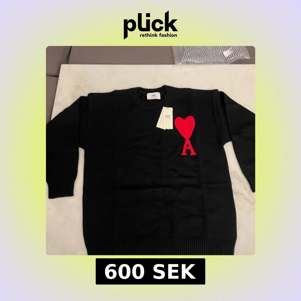 Svart stickad tröja från Ami Paris med rund hals och ribbade muddar. På bröstet finns ett stort rött hjärta och bokstaven A som signaturdetalj. Tröjan har lång ärm och är perfekt för dig som gillar stilrena plagg med en twist.