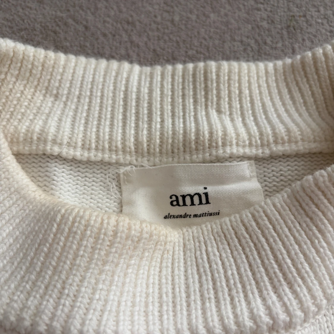 Vit stickad tröja från Ami med röd hjärtlogga på bröstet. Tröjan har rund halsringning och ribbade muddar vid ärmslut och nederkant. Perfekt för dig som gillar stilrena plagg med en twist.
