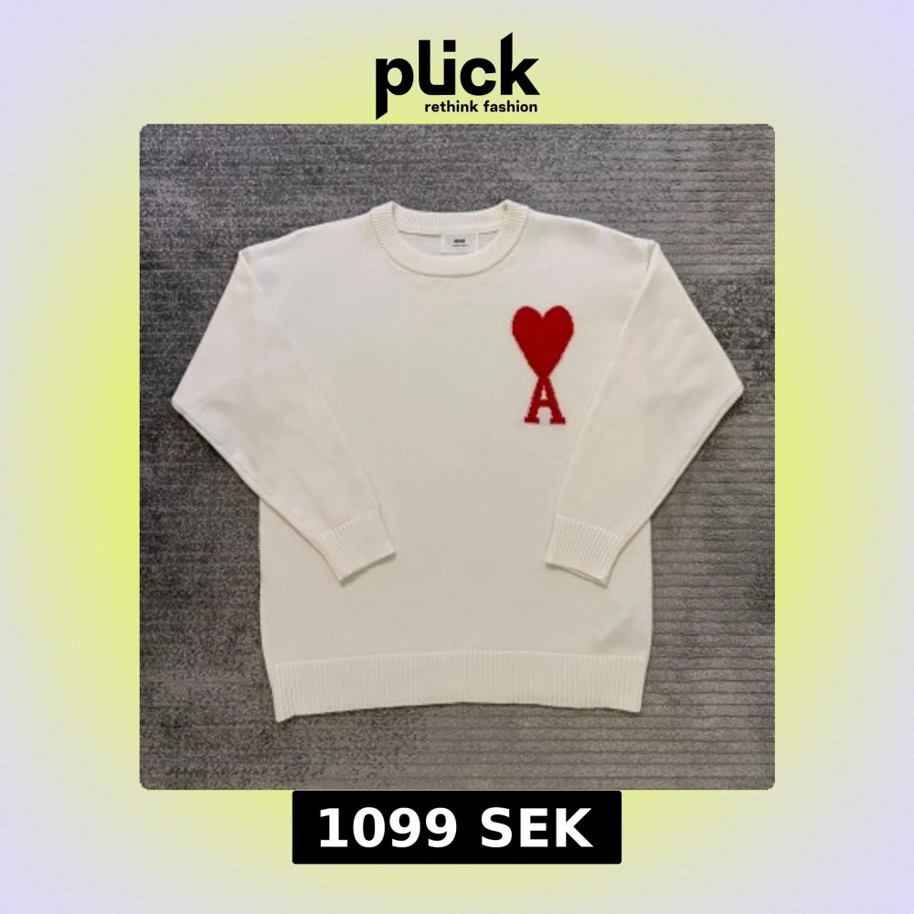 Vit stickad tröja från Ami Paris med röd hjärt- och A-logga på bröstet. Rund halsringning och ribbade muddar vid ärmslut och nederkant. Tröjan har en clean och stilren look som passar perfekt till jeans eller chinos. Materialet är mjukt och skönt.