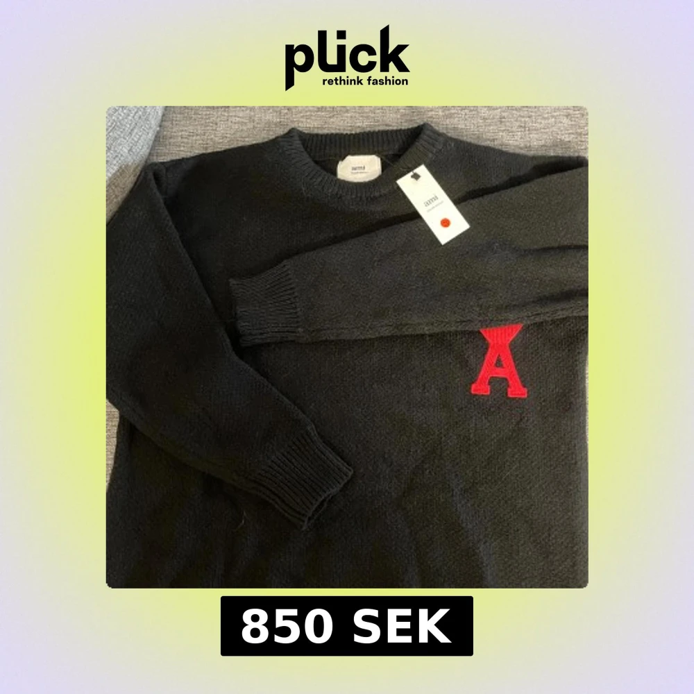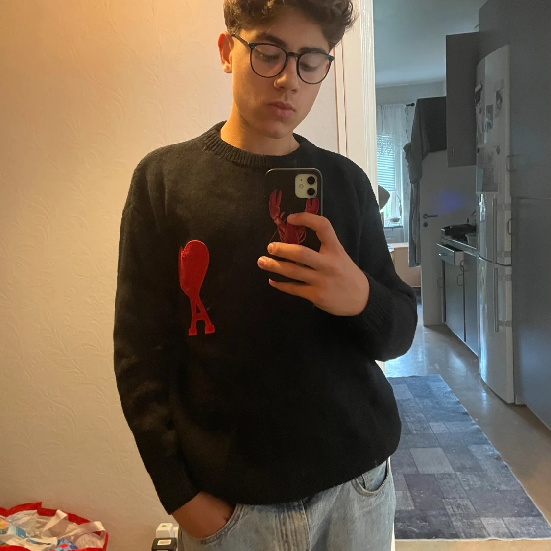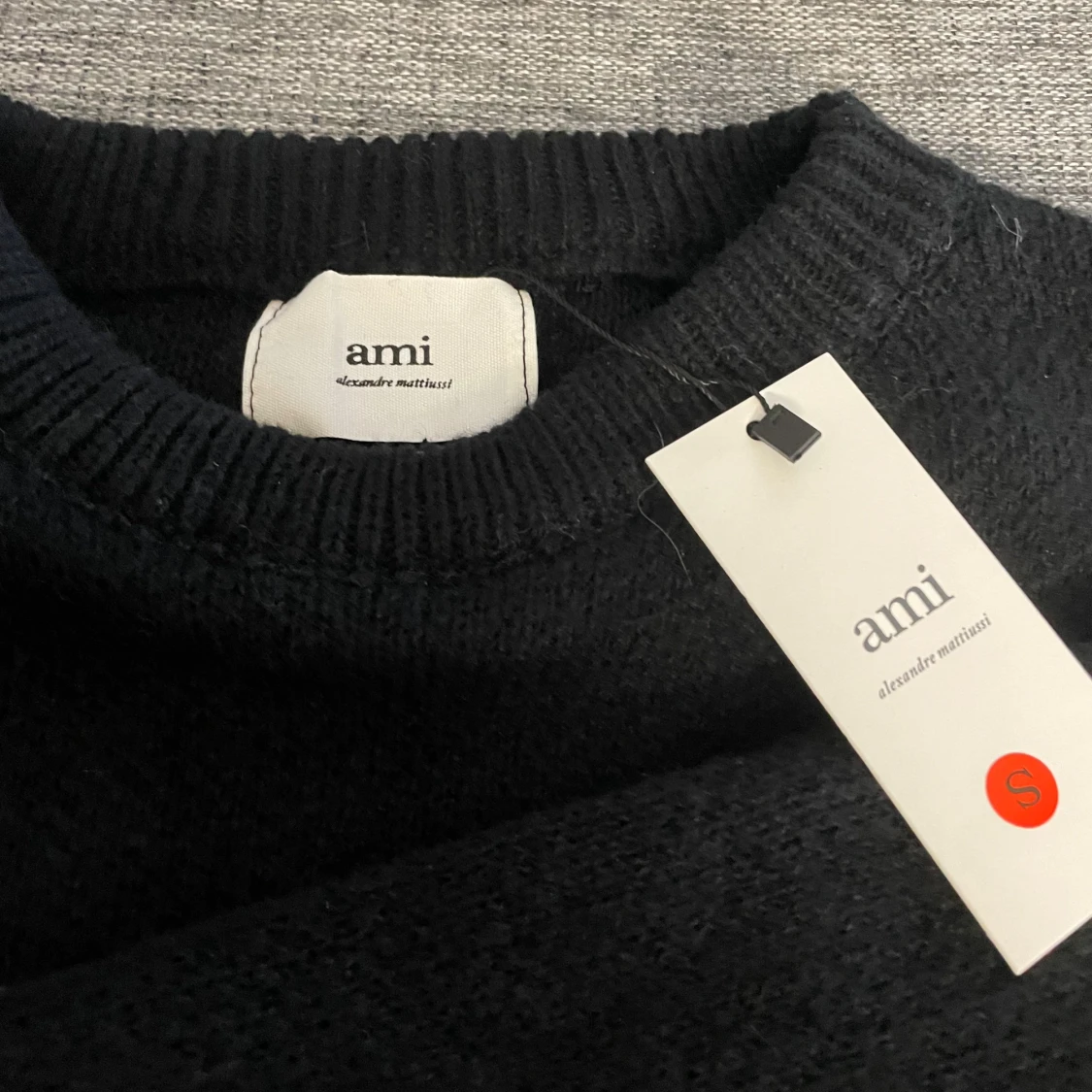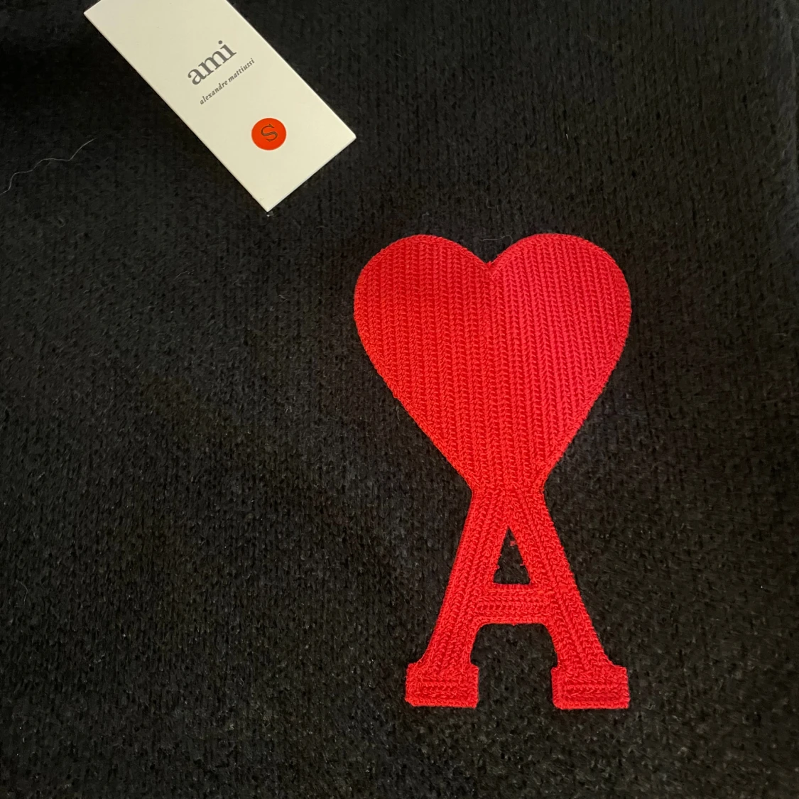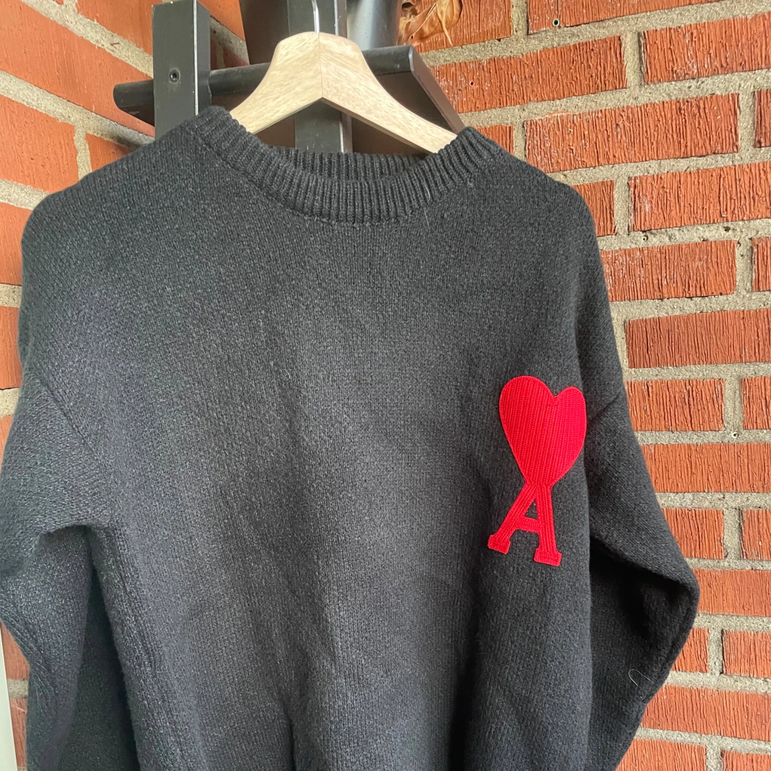 Svart stickad tröja från Ami Paris med rund hals och ribbade muddar. På bröstet sitter ett stort rött hjärta med bokstaven A, som är typiskt för märket. Tröjan har en clean och stilren look, perfekt till jeans eller byxor.