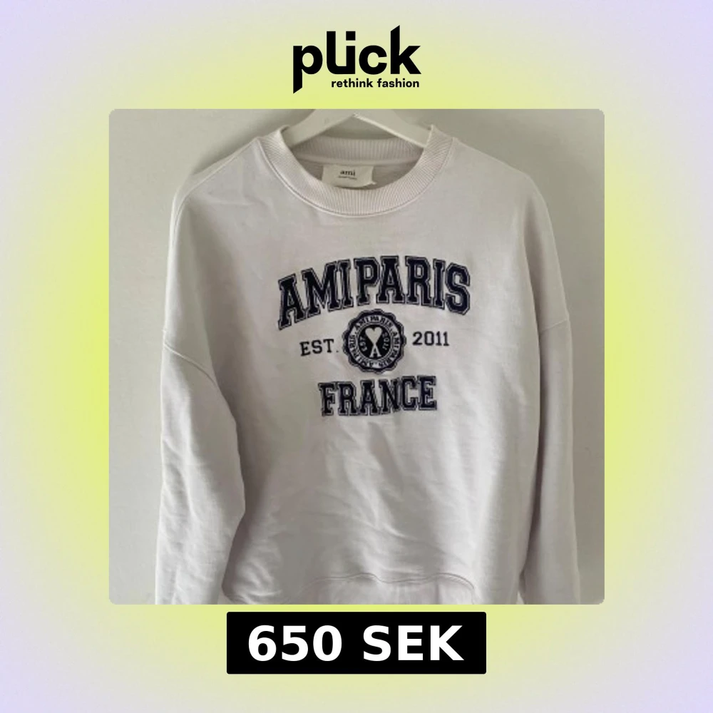 Säljer en stilren vit sweatshirt från Ami Paris med tryck framtill och en liten logga bak i nacken