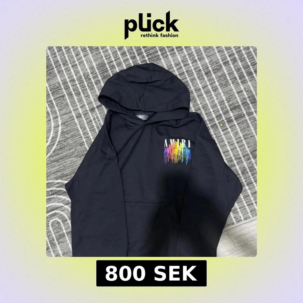 Svart hoodie från AMIRI i 100% bomull med stor huva och färgglatt regnbågstryck både fram och bak. Snyggt AMIRI-märke i metall vid nederkanten och coolt drip-mönster i flera färger. Perfekt för dig som gillar streetwear och vill sticka ut.