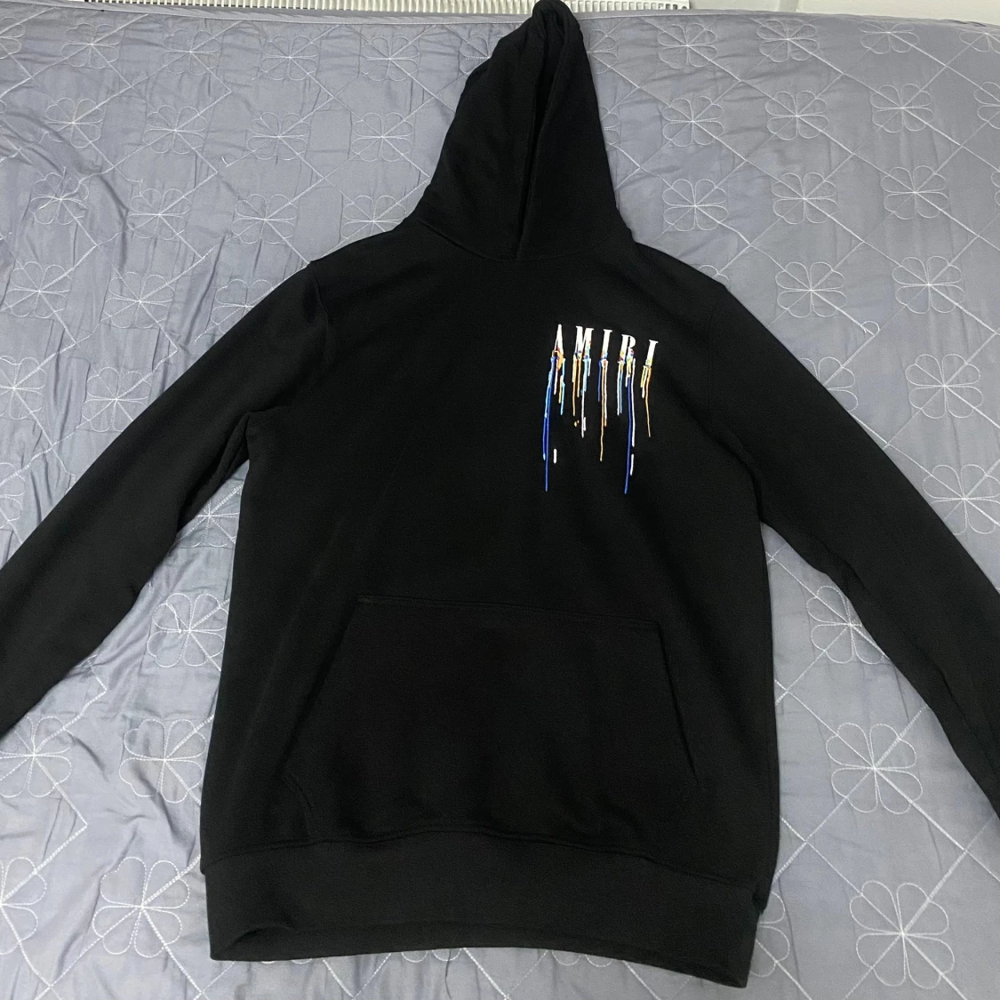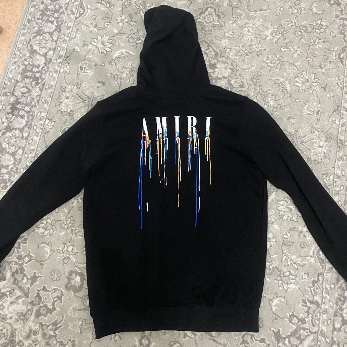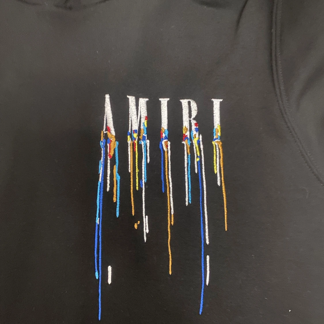 Svart hoodie från AMIRI med stor huva och känguruficka. Framtill och baktill finns AMIRI-logga med coolt färgstänksmönster i blått, vitt, gult och rött. Perfekt för dig som vill sticka ut med streetstyle. Mjuk och skön bomullskänsla.