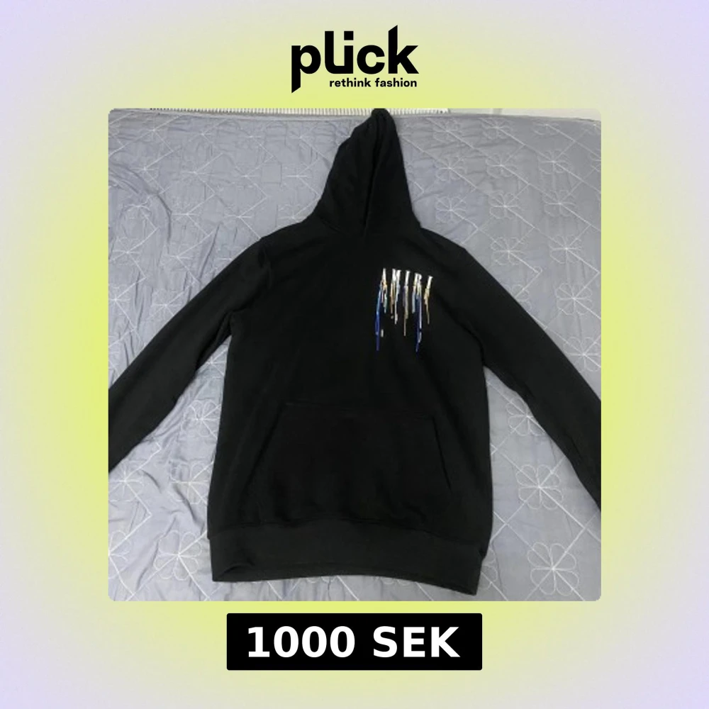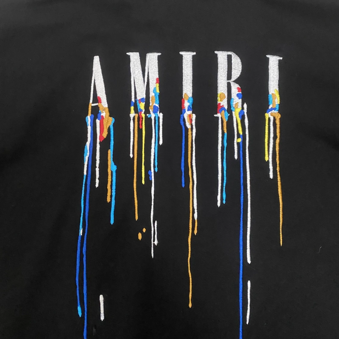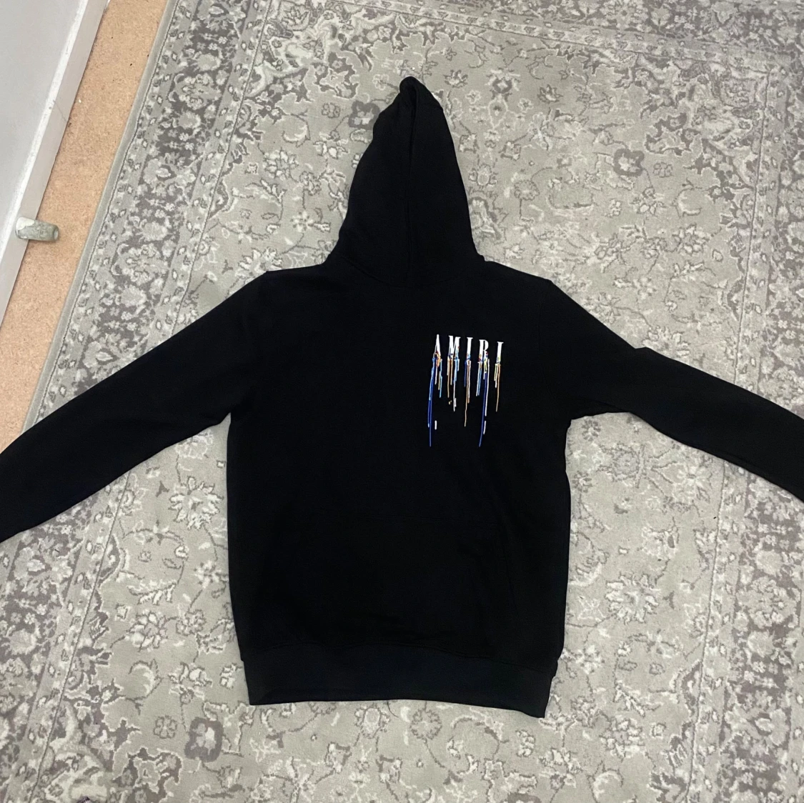 Svart hoodie från AMIRI med stor huva och känguruficka. Framtill och baktill finns AMIRI-logga med coolt färgstänksmönster i blått, vitt, gult och rött. Perfekt för dig som vill sticka ut med streetstyle. Mjuk och skön bomullskänsla.