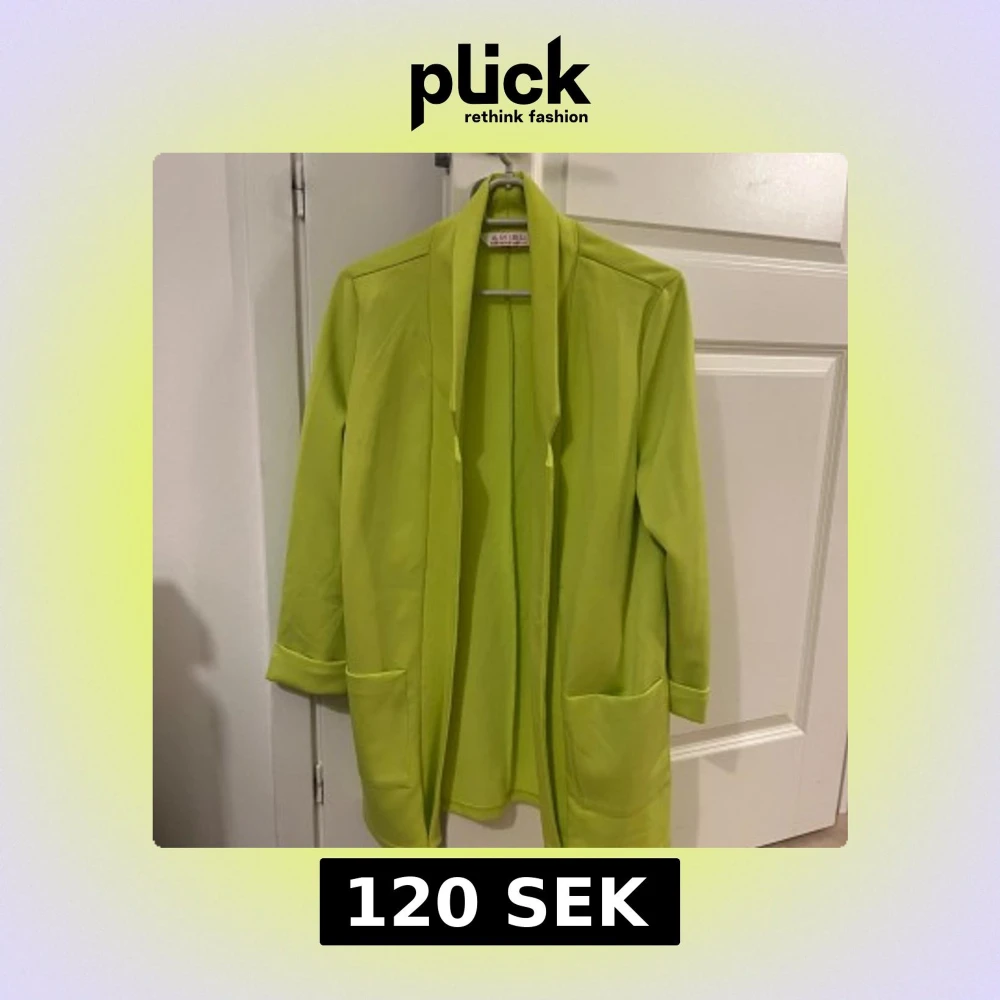 Snygg limegrön kavaj från Amisu med öppen front och två stora fickor framtill. Jackan har lång ärm med uppvikta muddar och en rak, avslappnad passform. Perfekt för dig som vill sticka ut med färg och enkel stil.