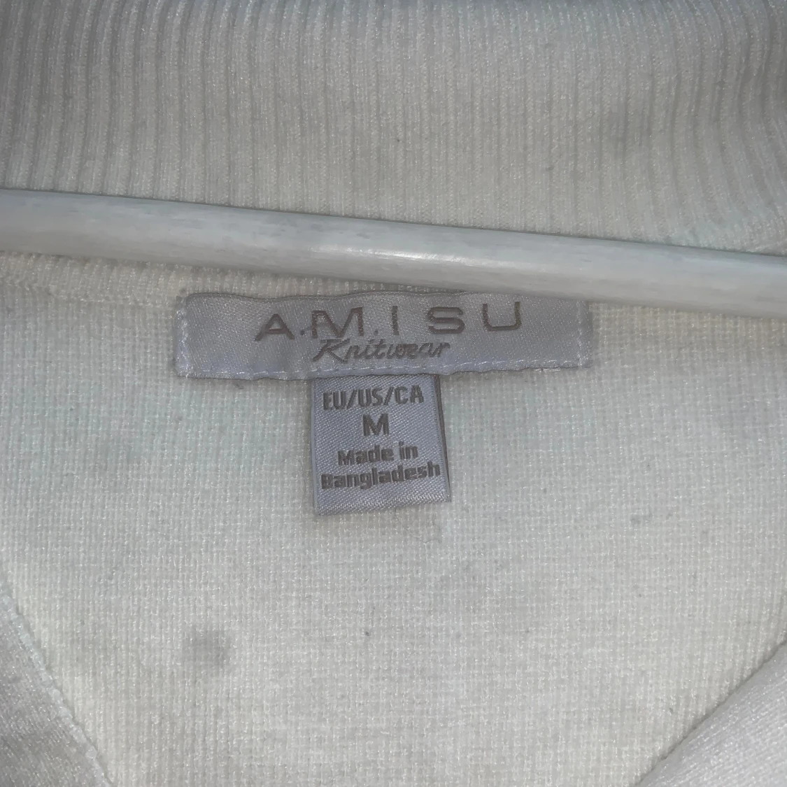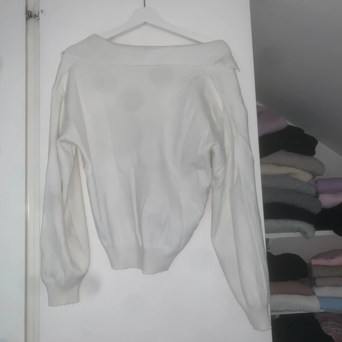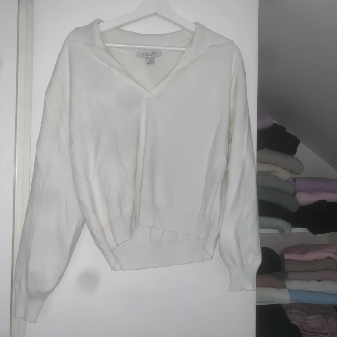 Säljer en vit tröja från Amisu med v-ringad hals och krage. Tröjan har långärmade ärmar och är i mjukt material. Passformen är normal och den är enkel att matcha med jeans eller kjol. Perfekt för dig som gillar clean och stilren look.