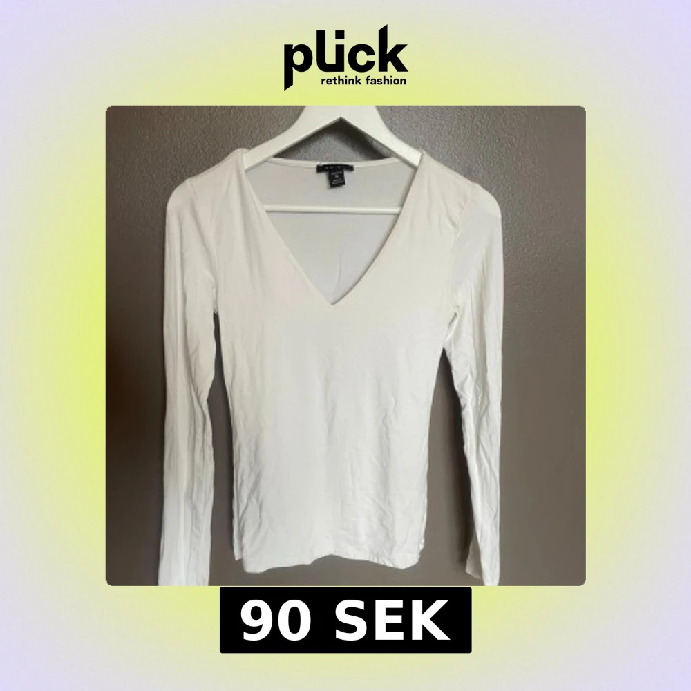 Vit långärmad topp från Amisu med v-ringning. Mjuk och bekväm passform – enkel att matcha till jeans eller kjol. Storlek: M Skick: Mycket fint skick.