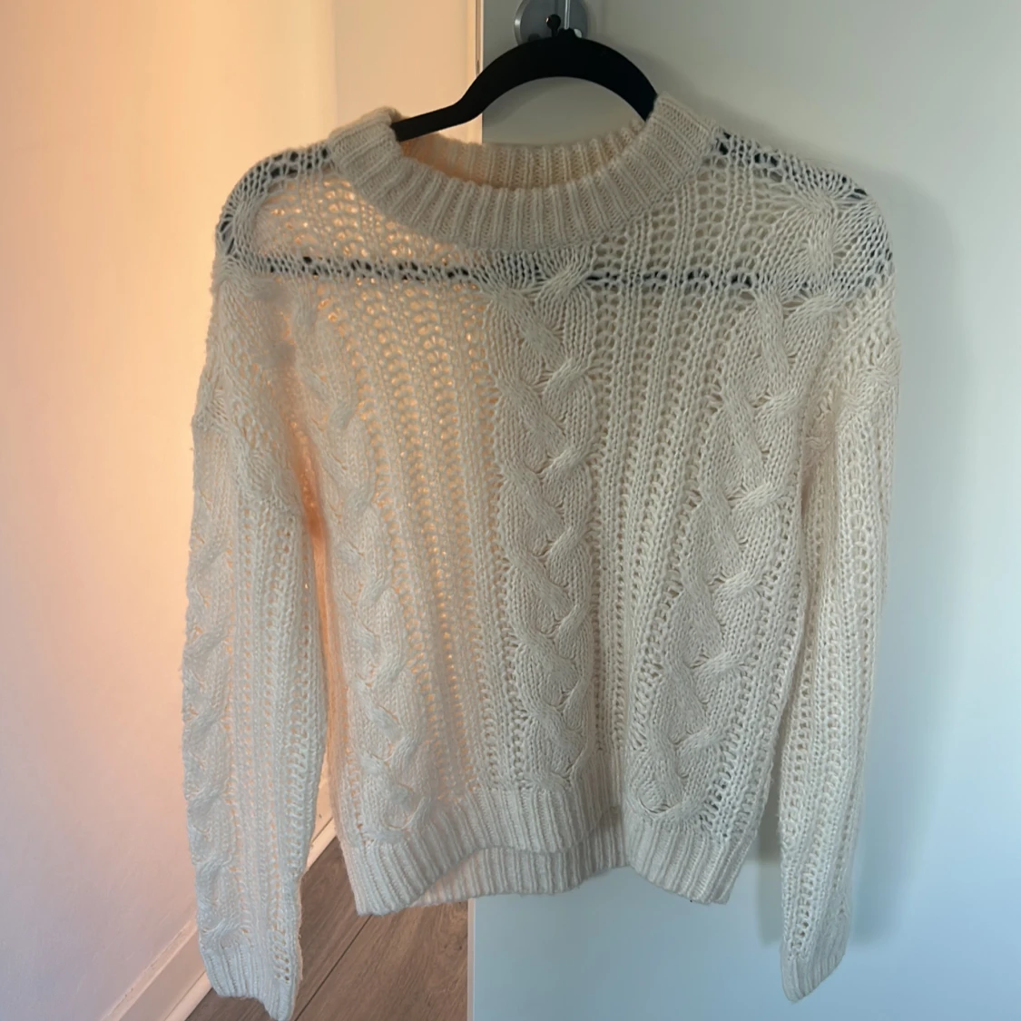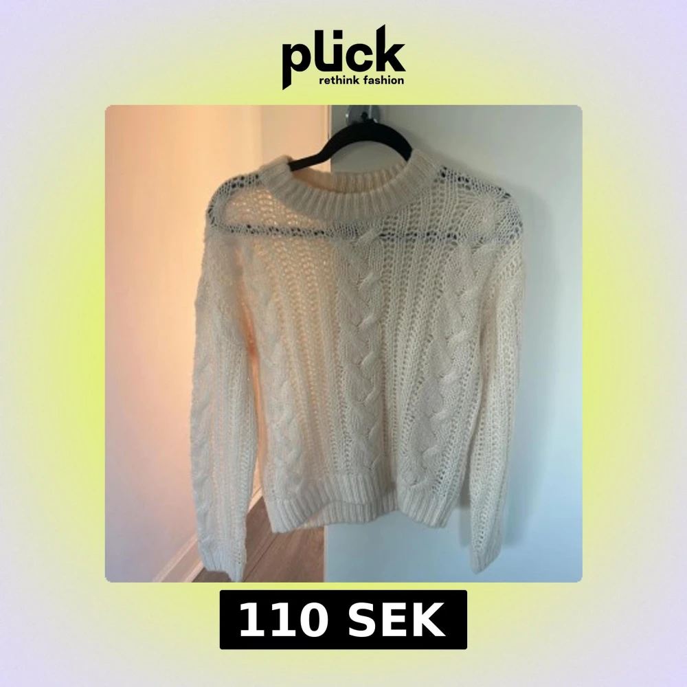 Säljer en beige stickad tröja med snyggt flätmönster och grov struktur. Tröjan har rund hals och långa ärmar, perfekt för att hålla sig varm och se chill ut under kyliga dagar. Passar dig som gillar klassisk stil med en modern twist.