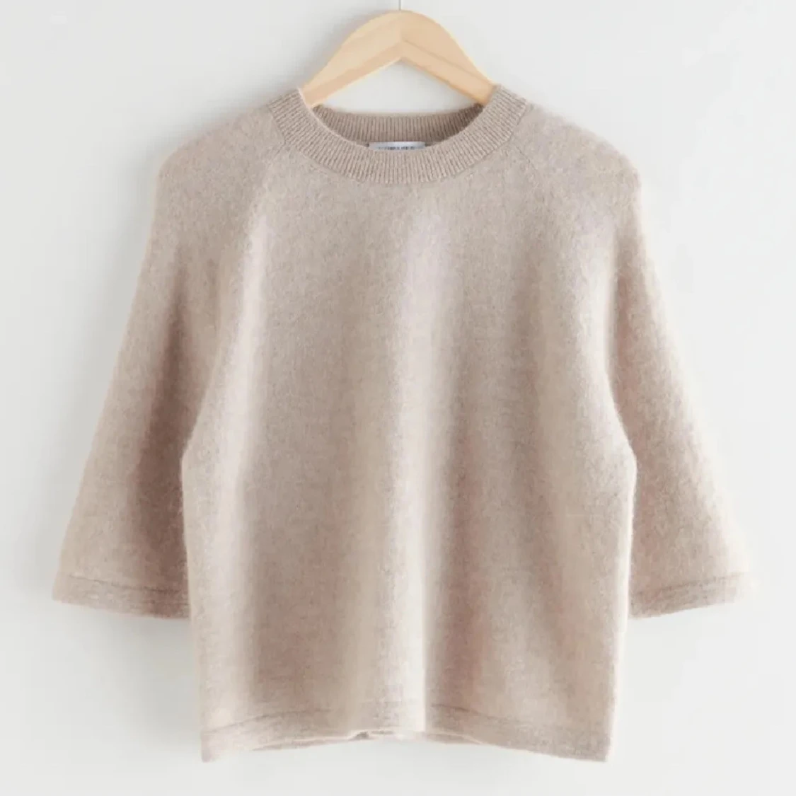 Säljer en mysig beige stickad tröja med trekvartsärm. Supersnygg men kommer tyvärr inte till användning är som ny endast använd fåtal gånger, skriv för fler bilder💕💕