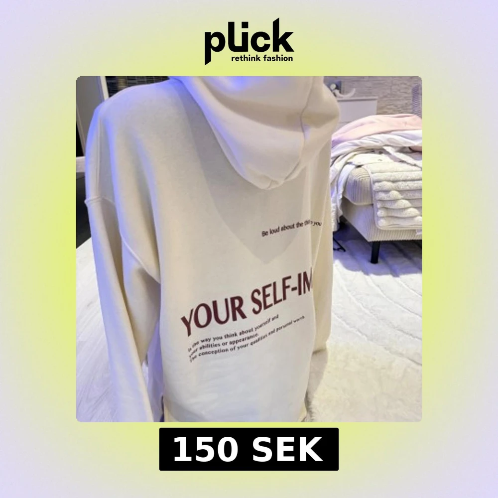 Vit hoodie med tryckt text 'SELF-IMAGE' i vinrött på både framsidan och baksidan. Tröjan har huva med snörning, magficka och ribbade muddar. Oversized passform och mjukt material som känns skönt mot huden. Perfekt för chill dagar. Passar bra som oversize modell.