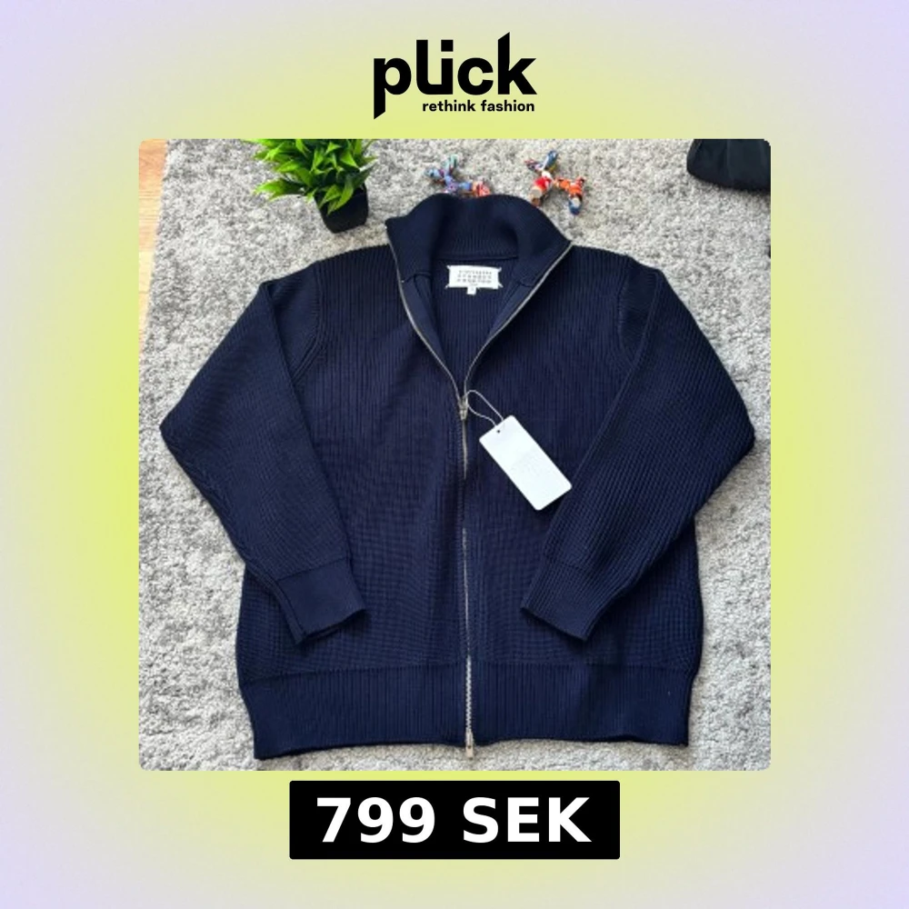 Snygg mörkblå stickad ziptröja från Maison Margiela med hög krage och grov struktur. Tröjan har långa ärmar, ribbade muddar och dragkedja framtill. Perfekt för dig som gillar stilrena och exklusiva plagg.