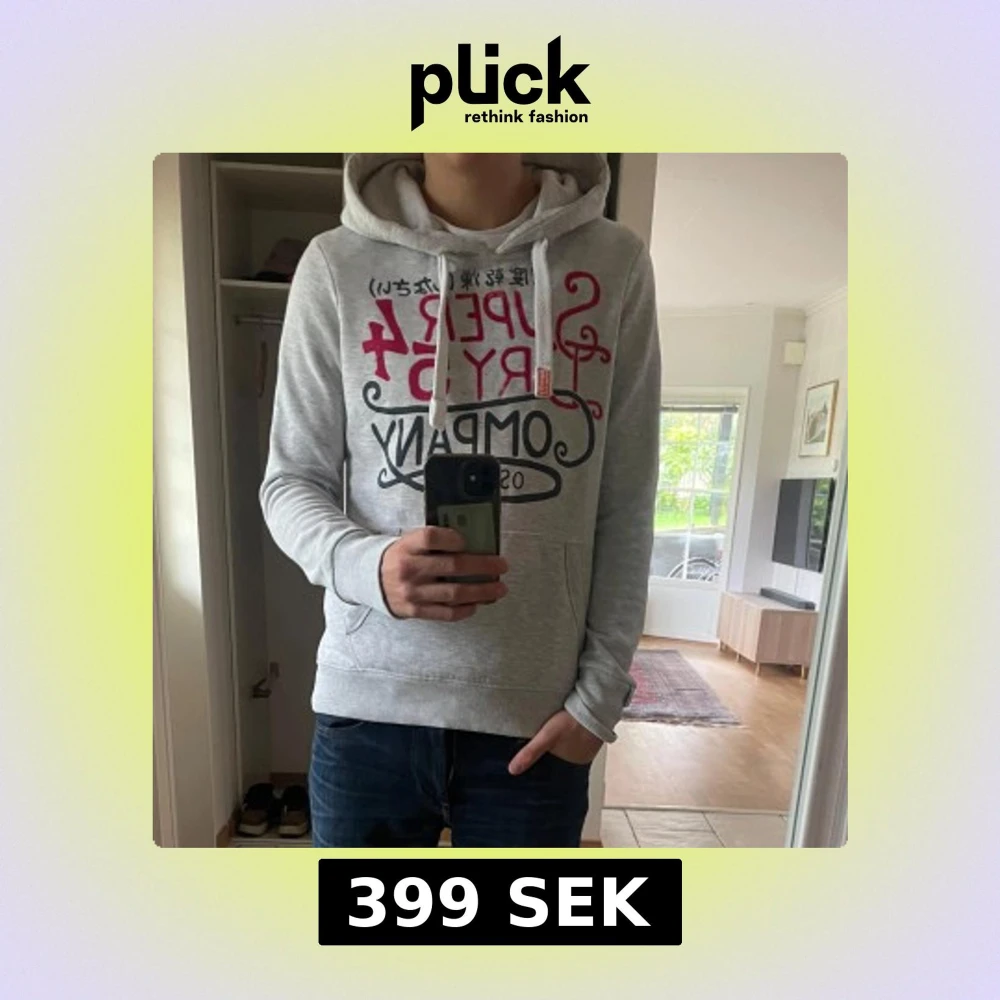 Säljer en grå hoodie från Superdry med stort tryck i rött och svart på bröstet. Tröjan har huva med snörning, känguruficka och ribbade muddar. Perfekt för dig som gillar streetwear och vill ha en snygg och bekväm look.