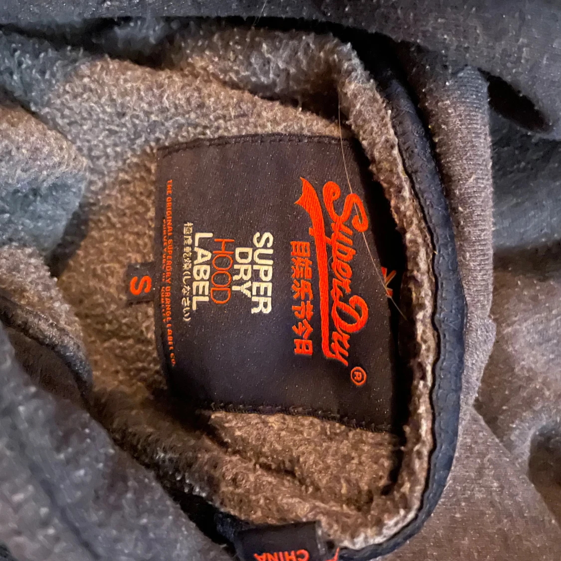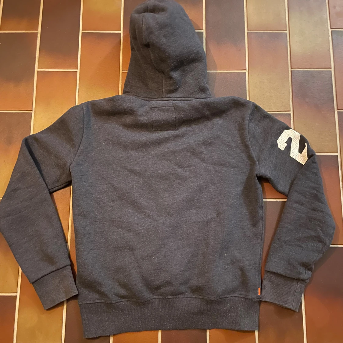 Snygg mörkgrå hoodie från Superdry med stort vitt och rött tryck på bröstet och siffran 28 i vitt på ena ärmen. Tröjan har huva med snörning och mjukt fleecefoder på insidan. Perfekt för dig som gillar streetwear och sportig stil.