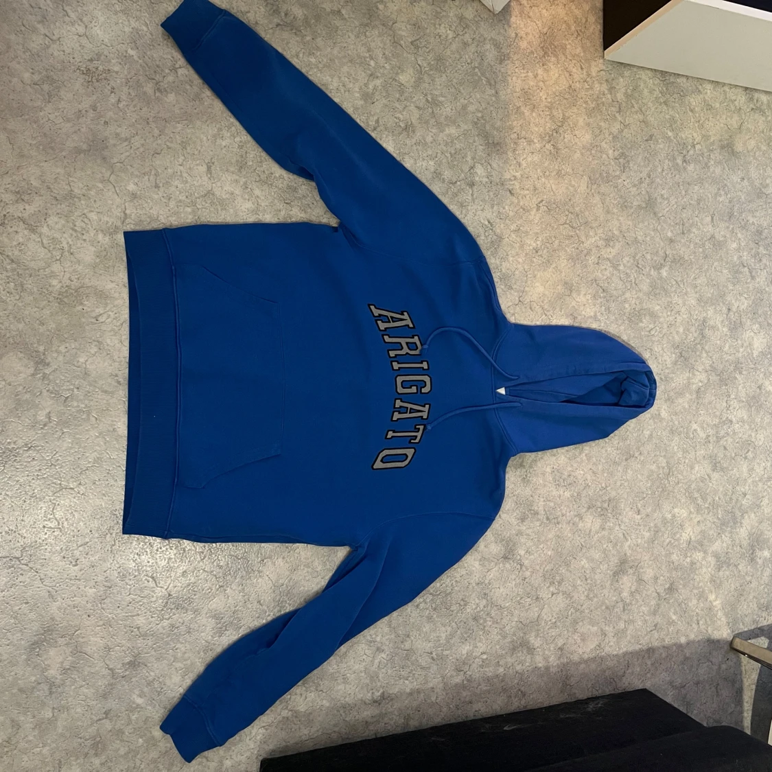 Säljer en blå hoodie från Arigato med stort tryck över bröstet. Tröjan har huva med snörning och en klassisk känguruficka framtill. Perfekt för dig som gillar streetwear och vill ha en snygg och bekväm look.