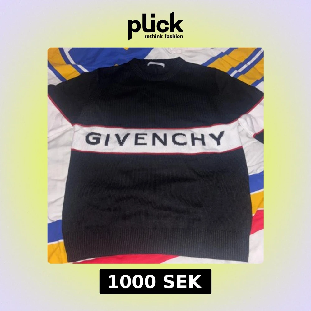 Snygg svart stickad tröja från Givenchy med vit panel och logga över bröstet. Tröjan har röda detaljer längs panelen och vita partier på ärmarna. Rund hals och långa ärmar med ribbade muddar. Perfekt för dig som gillar streetstyle och designer. Tröjan är i storlek L men passar även M. Priset kan diskuteras!!!
