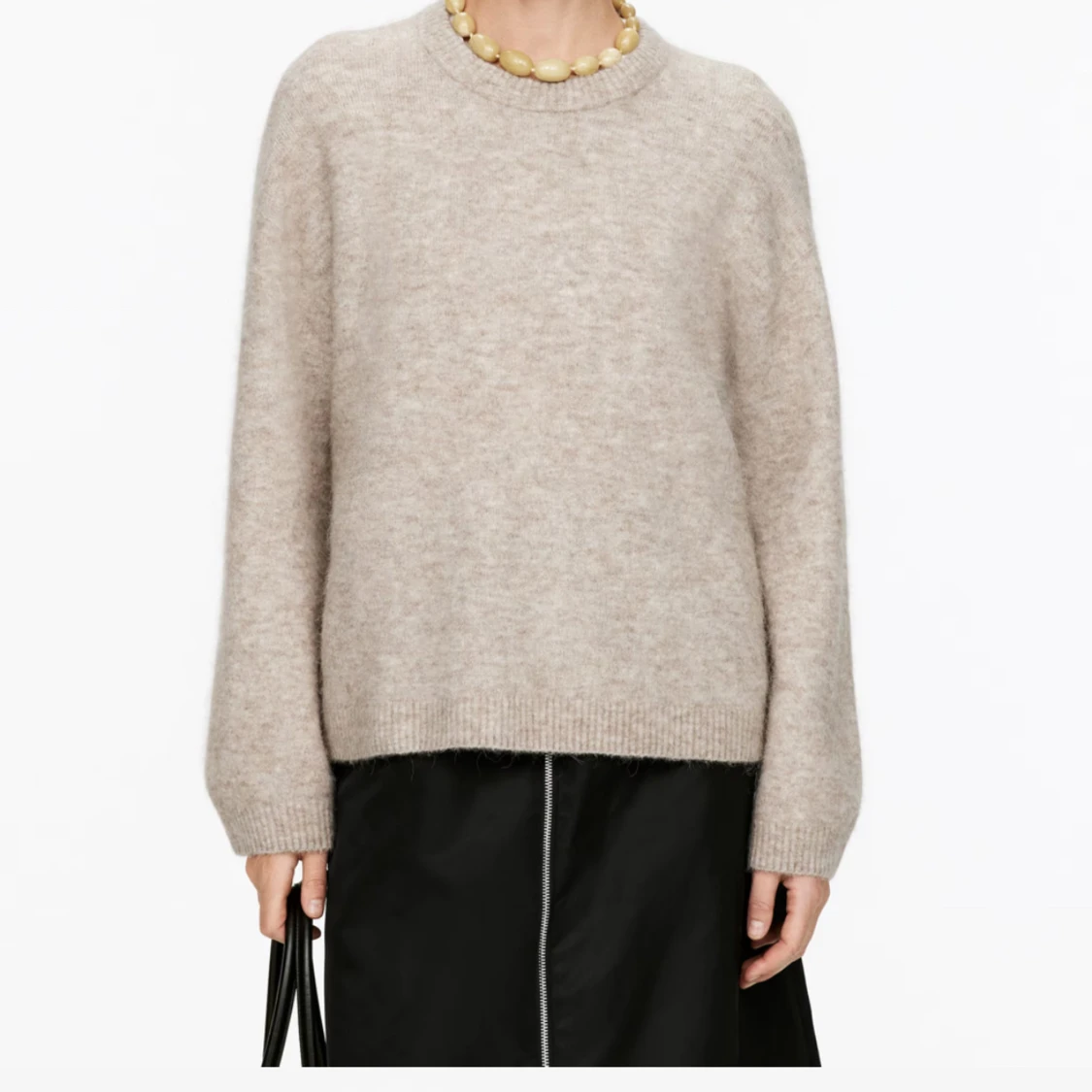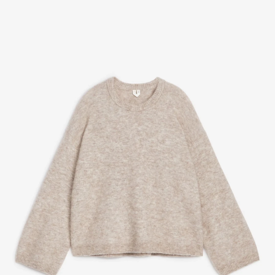 Supermjuk och fluffig beige stickad tröja från Arket med rund halsringning och långa ärmar. Perfekt för lager-på-lager och har en relaxed fit som ger en chill vibe. Ribbstickade muddar vid ärmslut och nederkant.