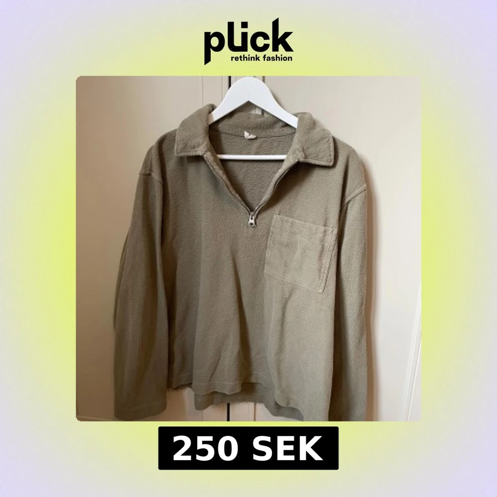 Säljer en grön tröja med dragkedja och krage. Tröjan har en bröstficka och långa ärmar, perfekt för en avslappnad stil. Från Arket