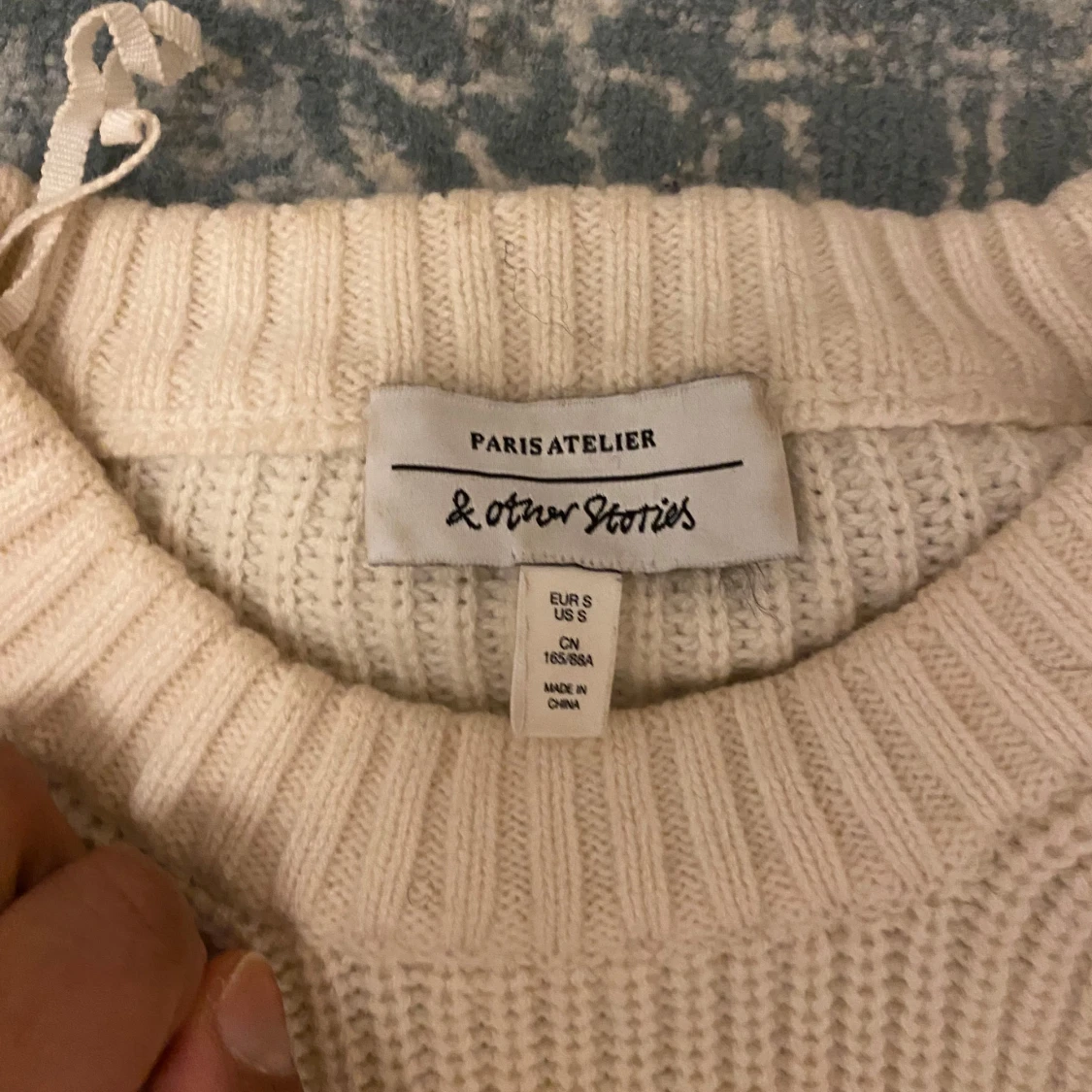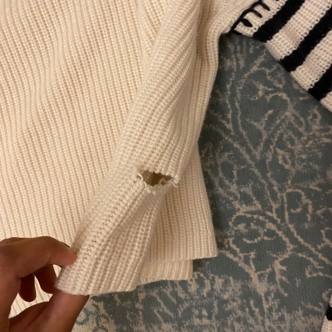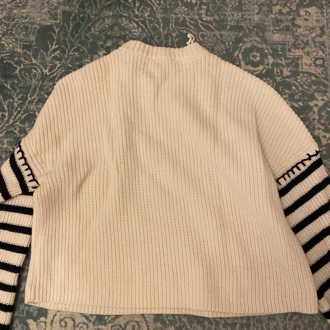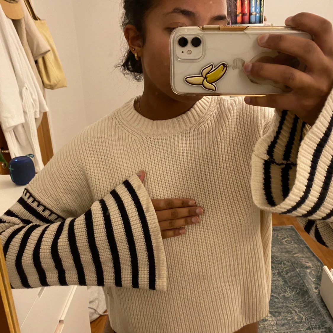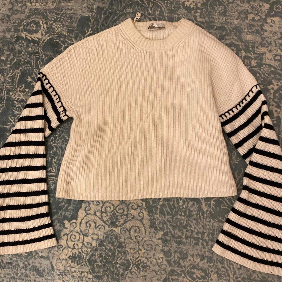 Så cool o snygg stickad tröja med vida randiga ärmar! Enda defekten är hålet i sidan (bild 5). Jag upplever inte att det syns när man har på sig den och det går garanterat att sy ihop, har bara ingen symaskin 😛