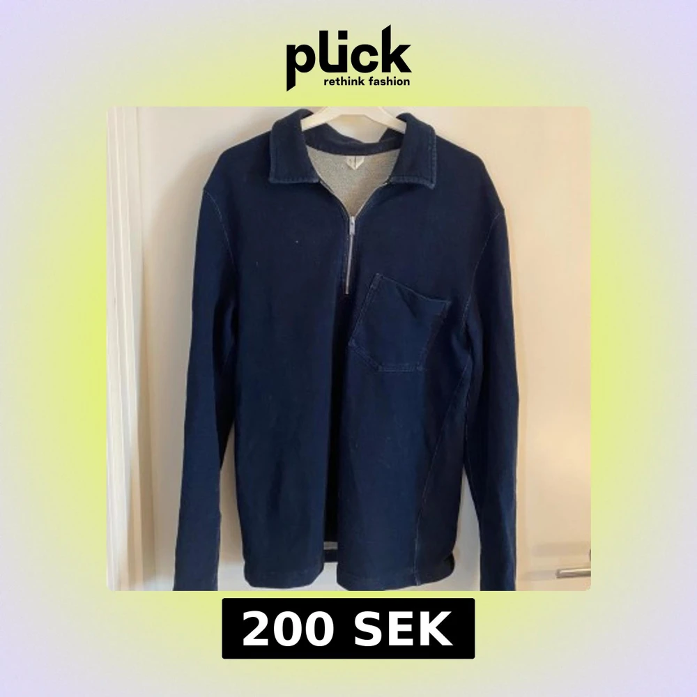 Säljer en mörkblå tröja med dragkedja och krage. Tröjan har en bröstficka och långa ärmar, perfekt för en avslappnad stil. Passar bra till jeans och är ett mångsidigt tillskott i garderoben.