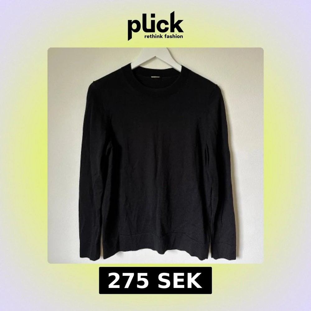 Svart stickad tröja från Arket i ekologisk ull. Klassisk rund hals och långärmad modell med ribbade muddar vid ärmslut och nederkant. Perfekt för lager-på-lager och enkel att matcha med jeans eller chinos. 1F8