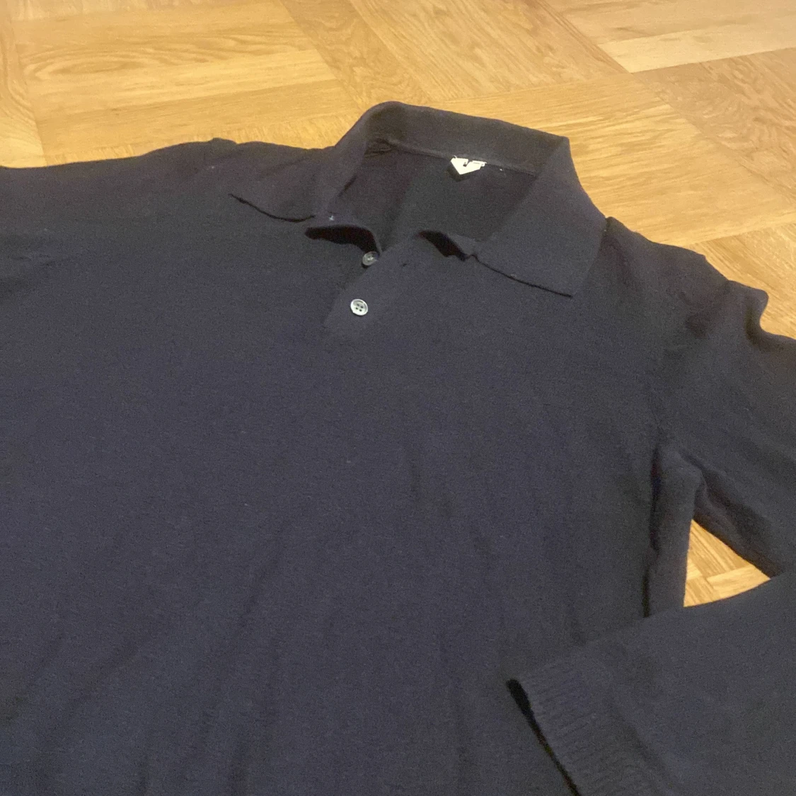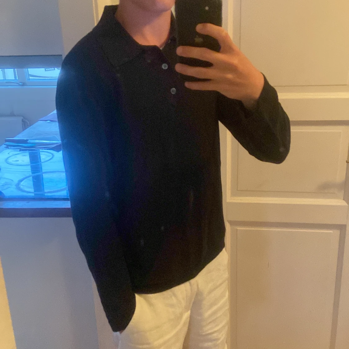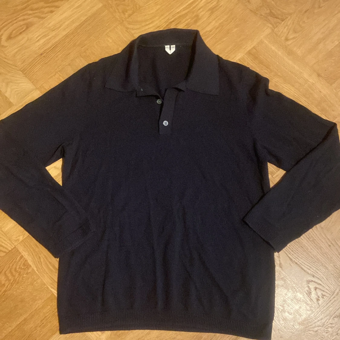 Säljer en svart långärmad pikétröja med klassisk krage och knäppning framtill. Tröjan är i mjuk bomull och har en clean, stilren look som funkar till många outfits. Perfekt för dig som gillar enkel och tidlös stil.