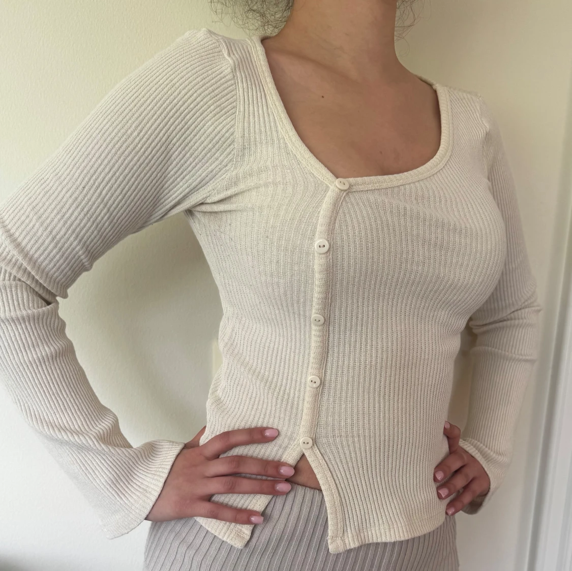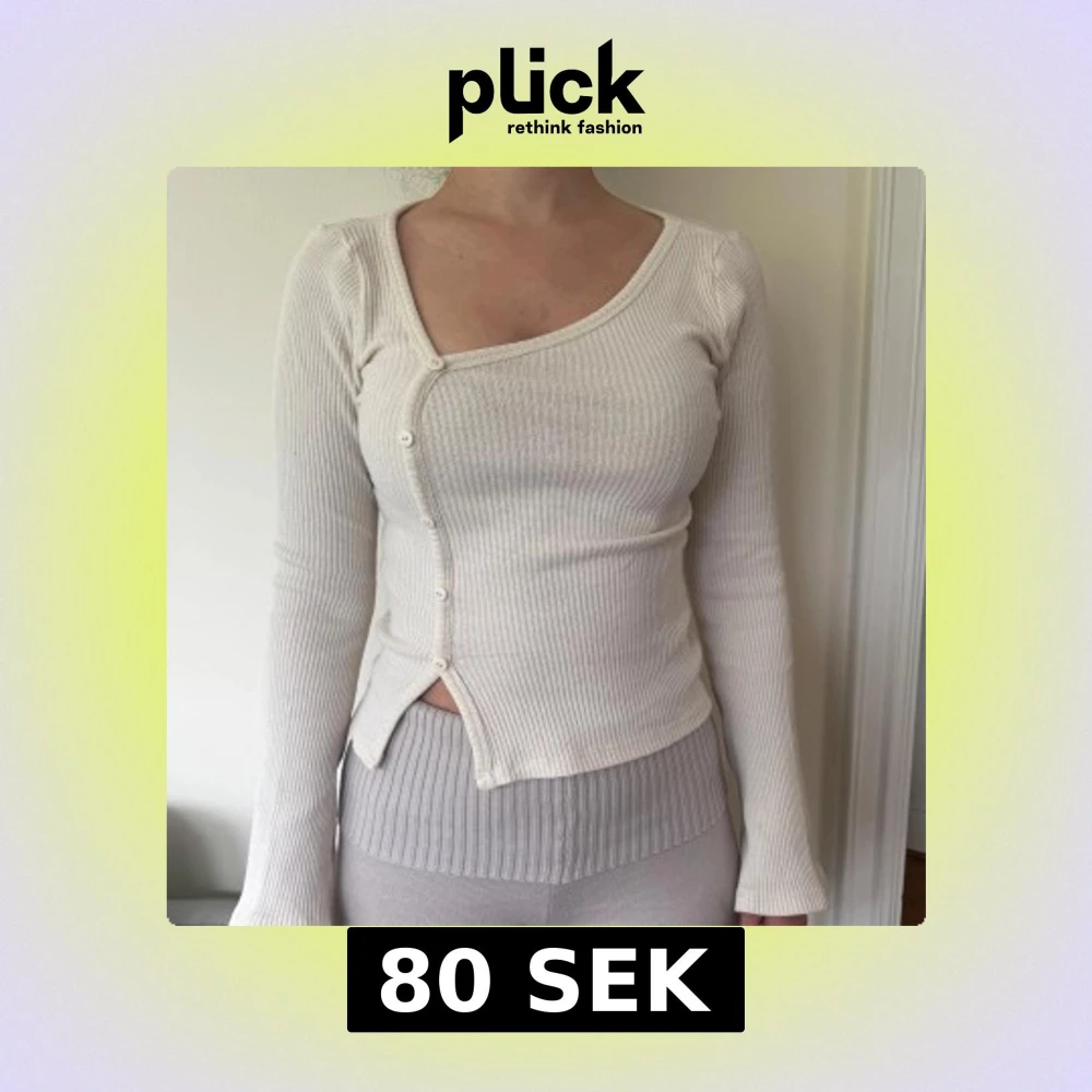Säljer en vit ribbad topp med lång ärm och asymmetrisk omlottknäppning framtill. Tröjan har en unik design med sned knapprad och lätt croppad passform. Perfekt för dig som gillar stilrena och trendiga plagg.