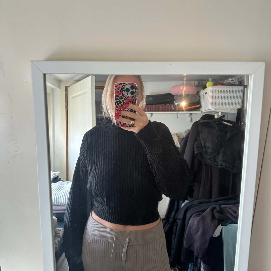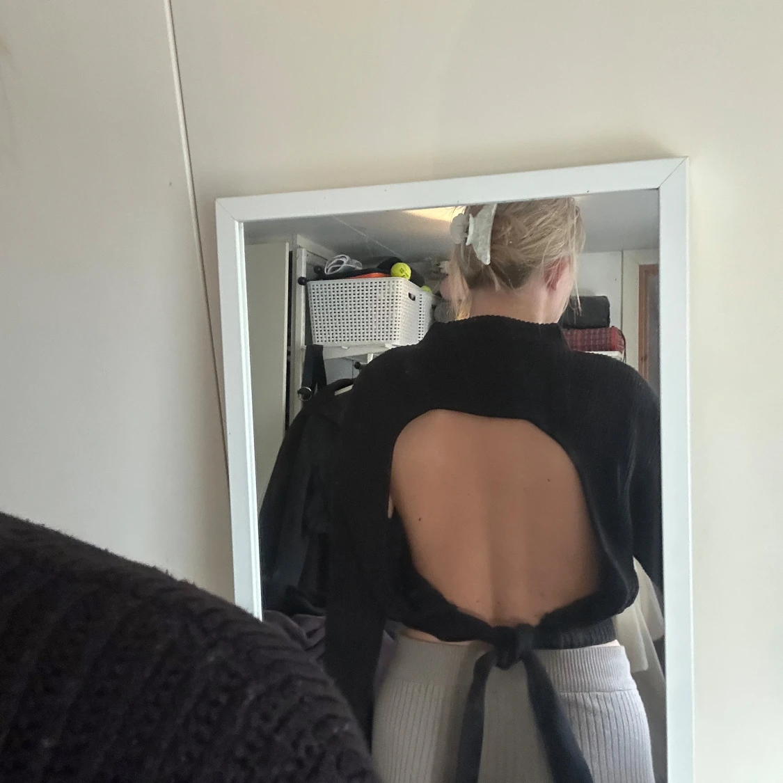 Säljer en svart croppad tröja med öppen rygg och knyt i midjan. Tröjan har lång ärm och är ribbad i materialet, vilket ger en snygg struktur. Perfekt för dig som vill ha något unikt och trendigt!