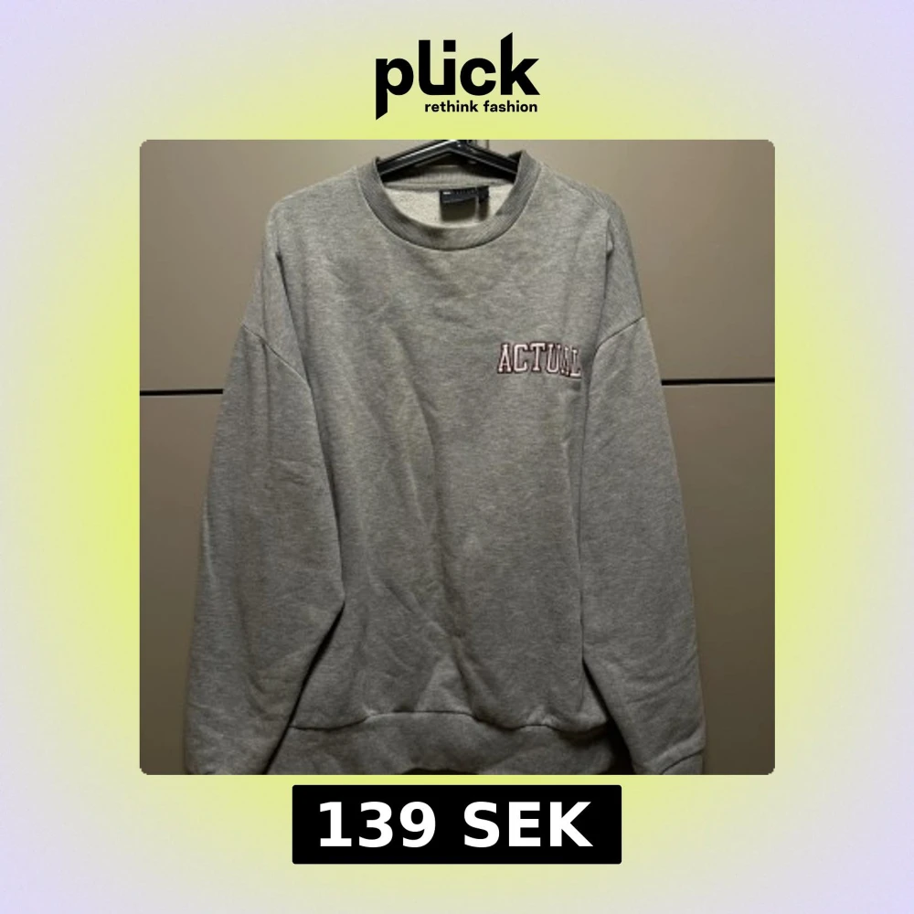 Säljer en grå sweatshirt med texten 'ACTUAL' broderad på bröstet. Tröjan har en klassisk rund hals och långa ärmar. Avslappnad och boxy passform.