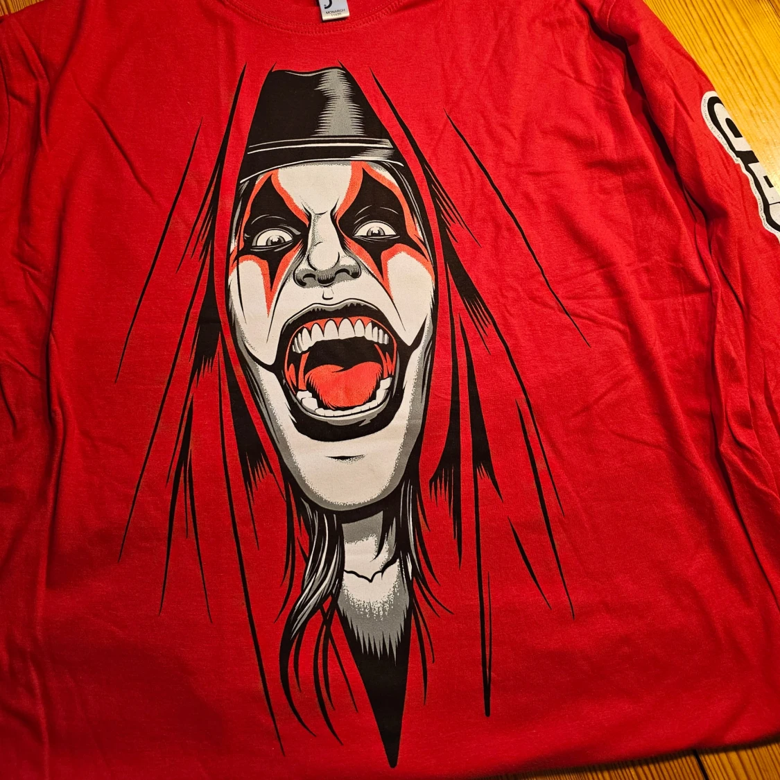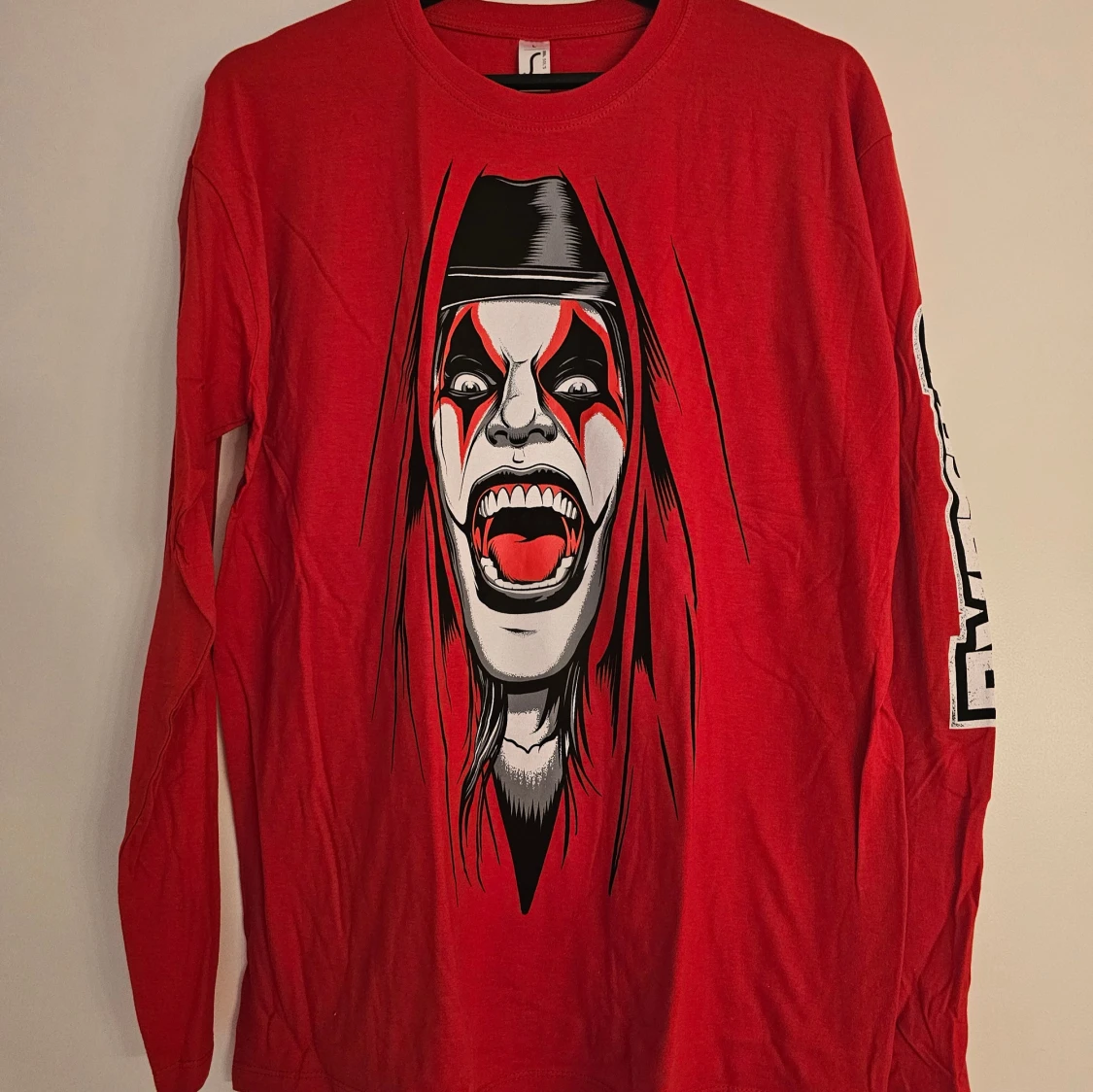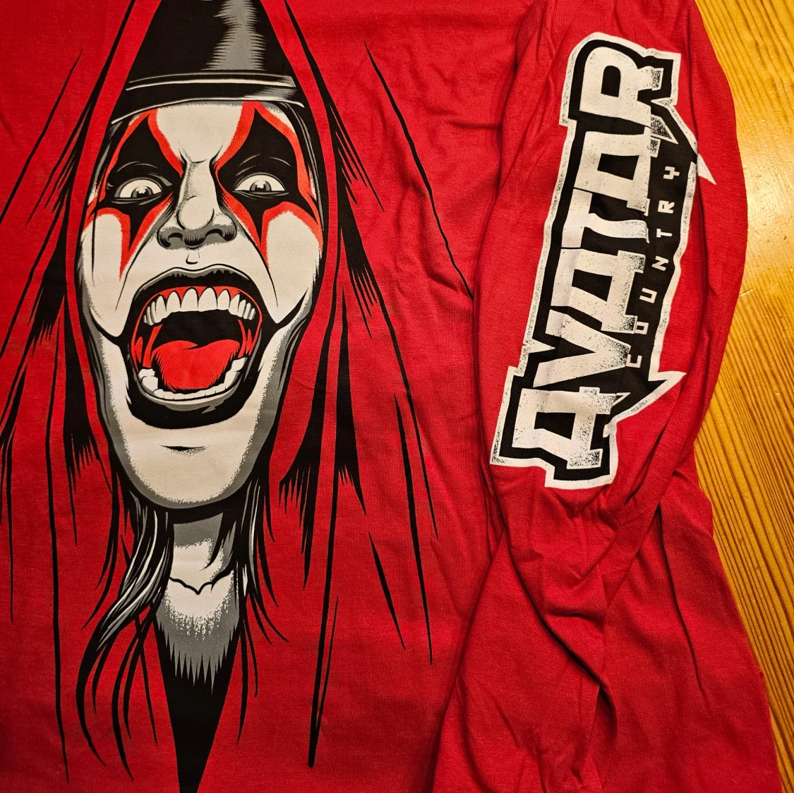 Säljer en röd långärmad tröja med stort tryck på framsidan. Inget på baksidan och ena ärmen står det Avatar på.