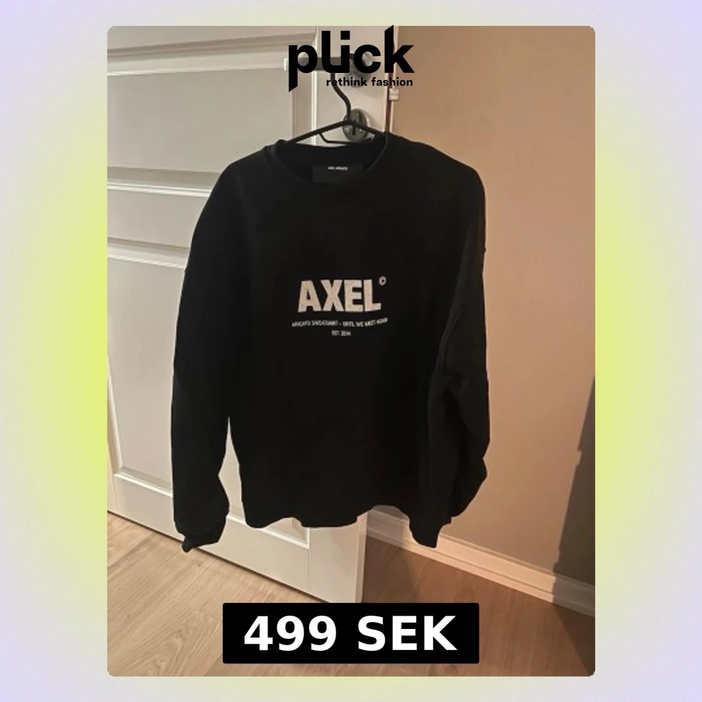 Cool svart sweatshirt från Axel Arigato med vit text på bröstet där det står 'AXEL' och 'ARIGATO SWEATSHIRT - UNTIL WE MEET AGAIN EST. 2014'. Klassisk rund halsringning och avslappnad passform. Perfekt till jeans eller joggers. Köptes ny på Arigato för 1800kr använd max 4 gånger.