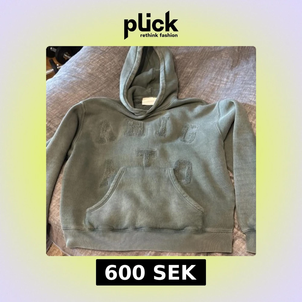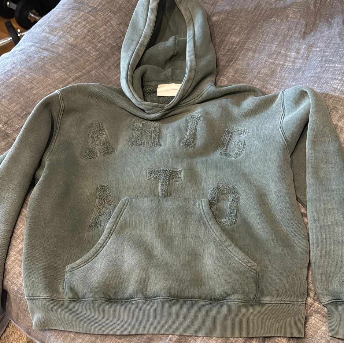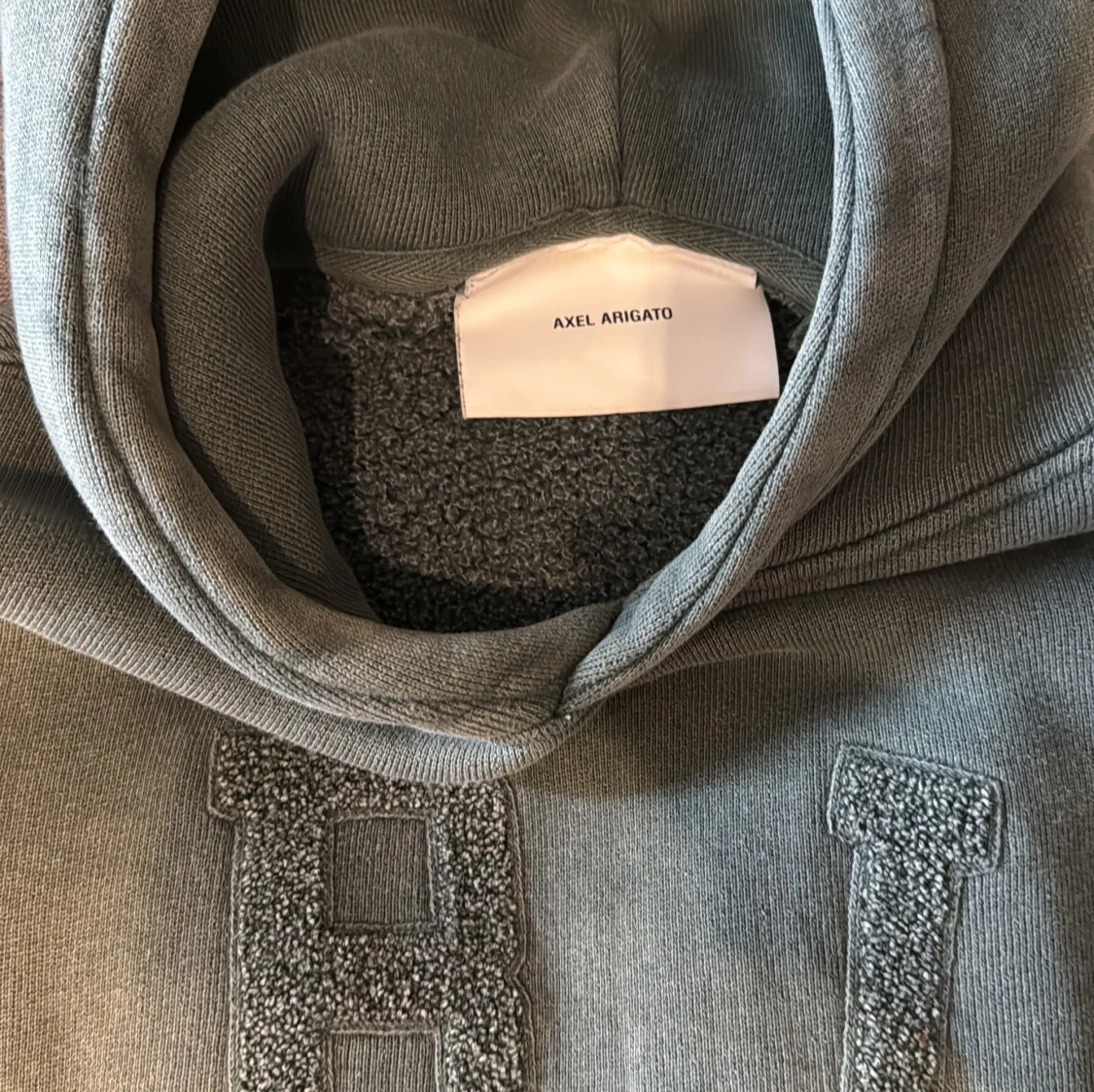 Säljer en grön hoodie från Axel Arigato med broderad text på bröstet. Tröjan har huva och en stor magficka framtill. Perfekt för en avslappnad stil och enkel att matcha med jeans eller joggers. Rymlig i storlek !