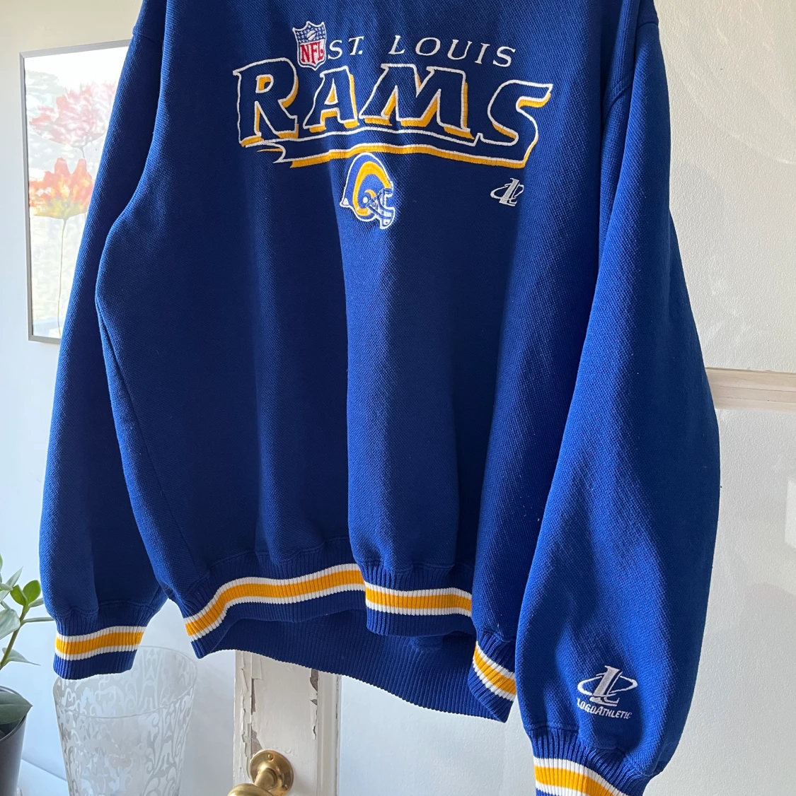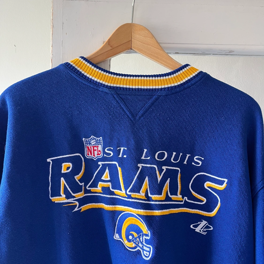 En blå vintage St louis Rams NFL sweatshirt. Tröjan är i bra skick utan något slitage. Tröjan är i storlek L men passar bra på mig som har M. Tröjan är i bra material. skriv gärna för fler bilder eller funderingar kring tröjan.