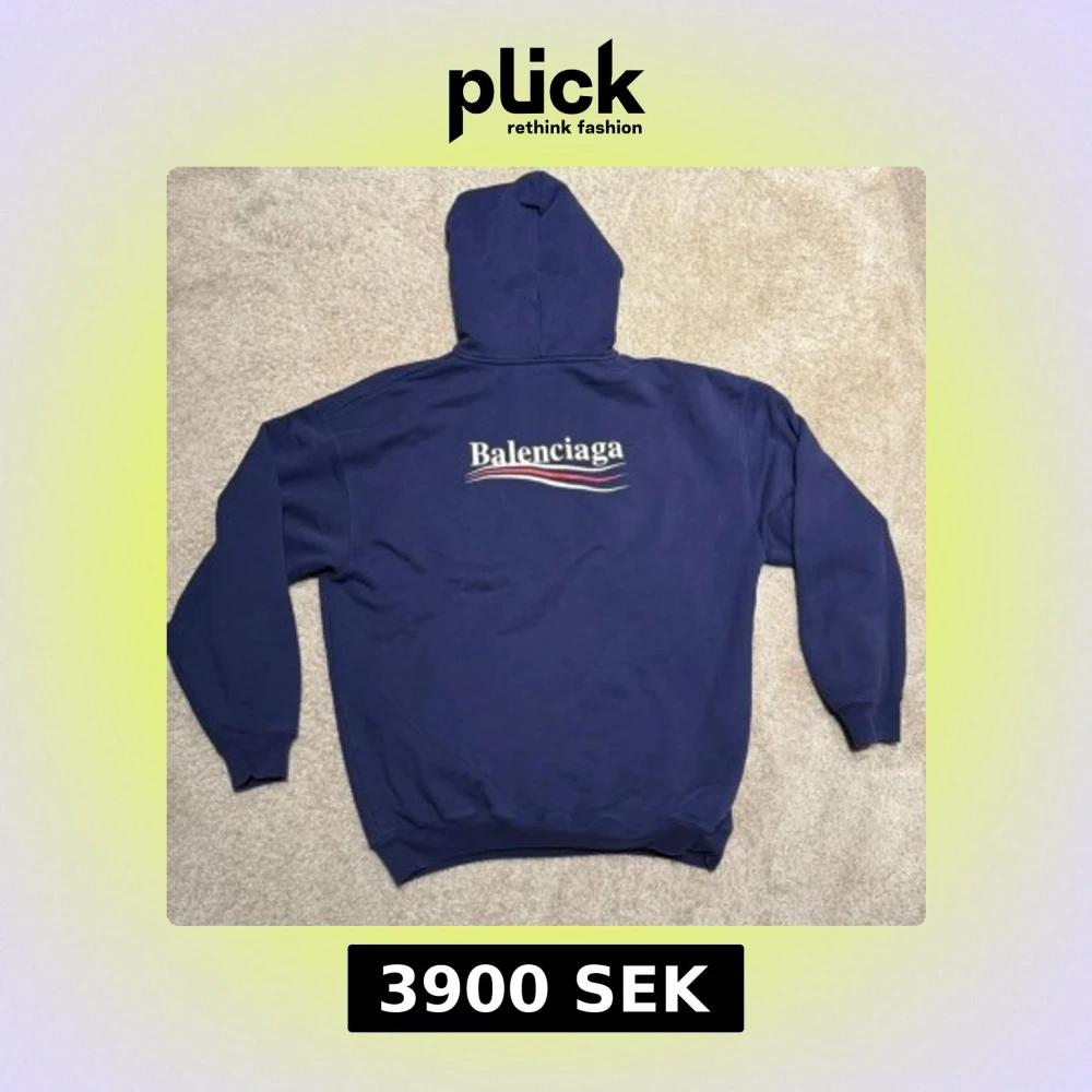 Säljer en mörkblå hoodie från Balenciaga med vit logga och vågigt rött och blått tryck på både bröstet och ryggen. Storlek M
