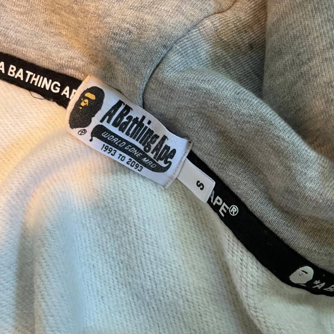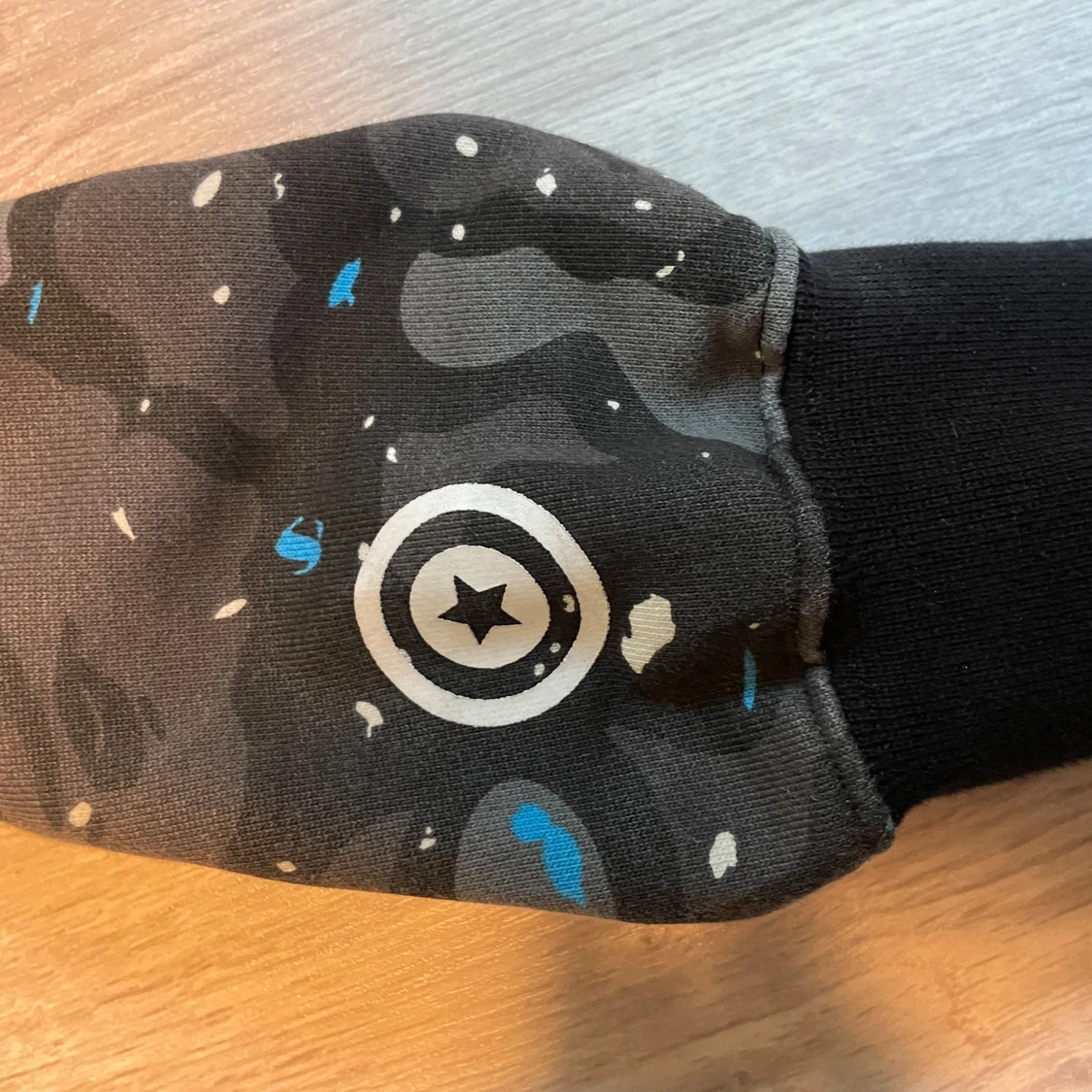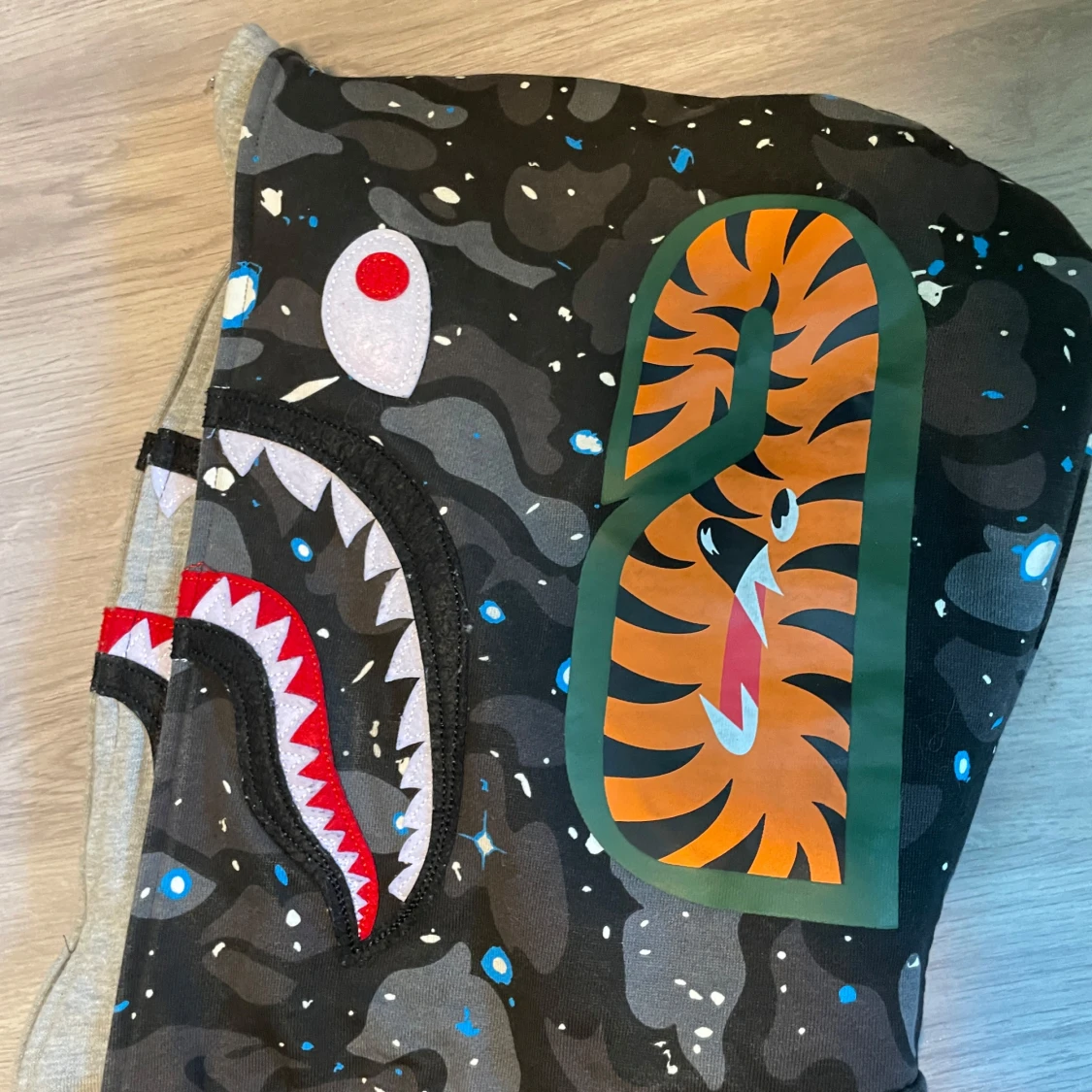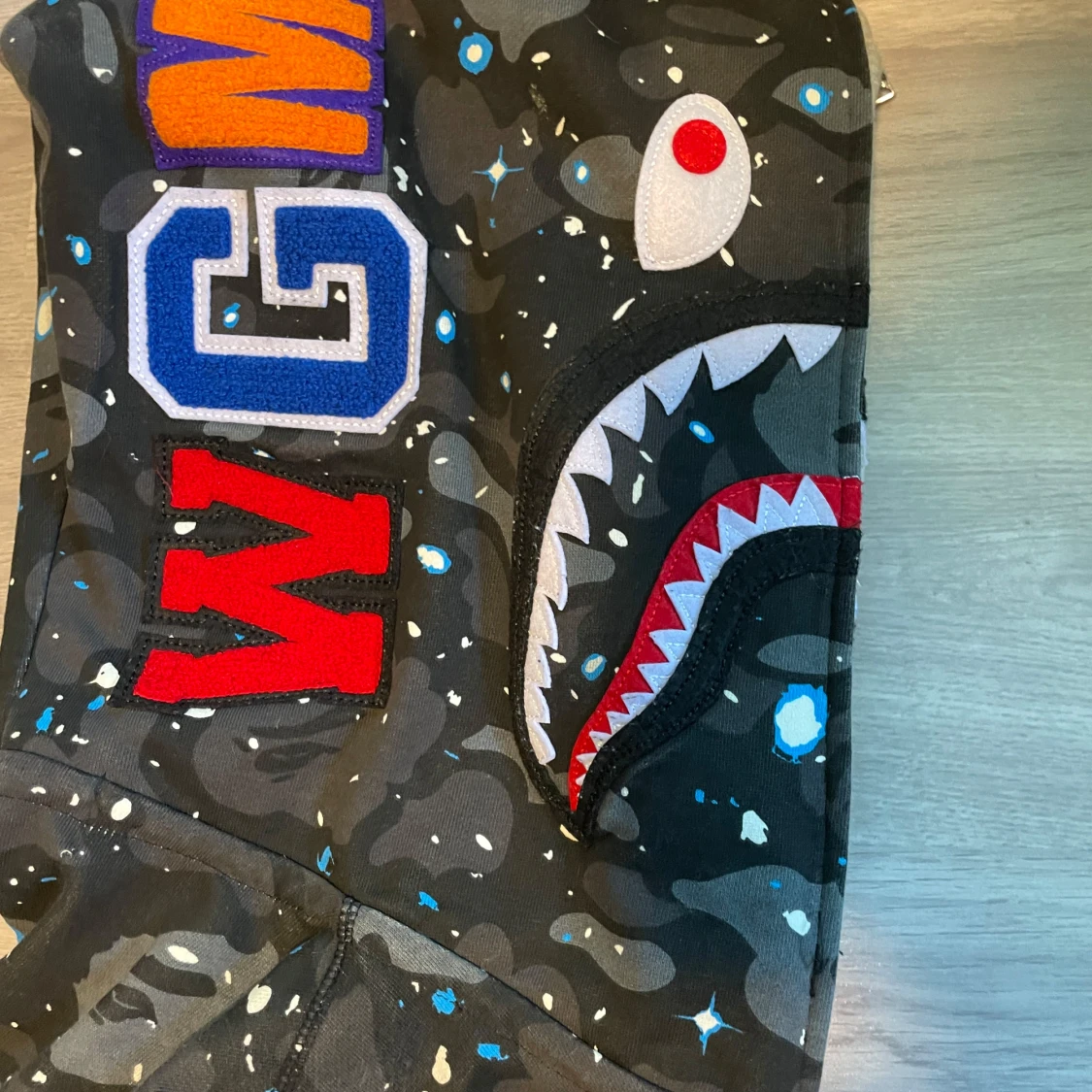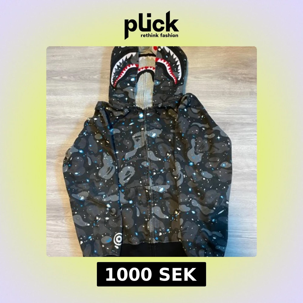 Säljer en svart camo hoodie från BAPE med hajmotiv på huvan och broderade bokstäver på sidan. Hoodien har dragkedja hela vägen upp och coola detaljer i blått, vitt och grått. Perfekt för dig som gillar streetwear och vill sticka ut.