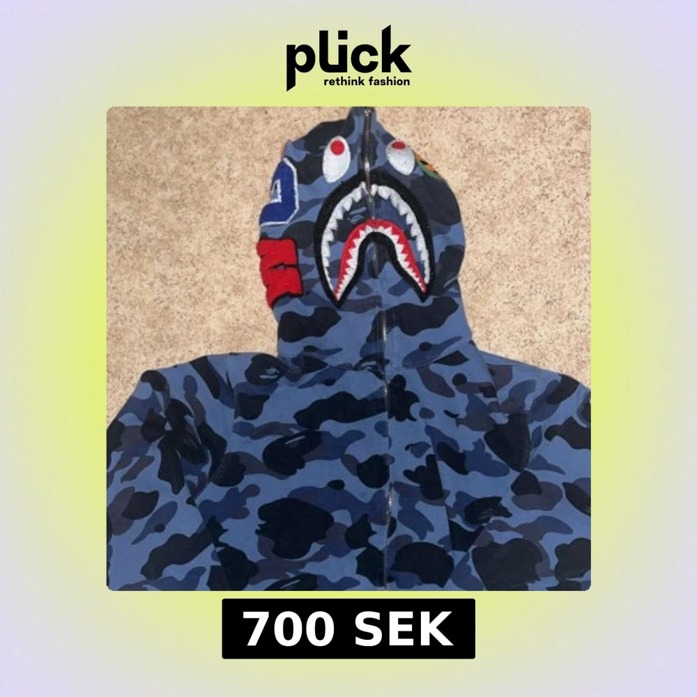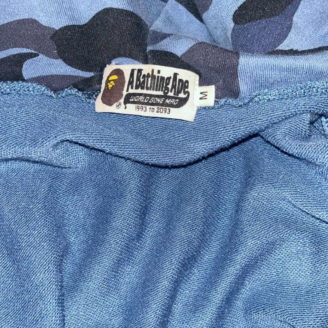 Säljer en ikonisk blå camo hoodie från BAPE med hajmotiv på huvan och dragkedja hela vägen upp. Tröjan har ribbade muddar, coola detaljer och klassisk BAPE-logga på ärmen. Perfekt statement piece för streetwear-stilen.