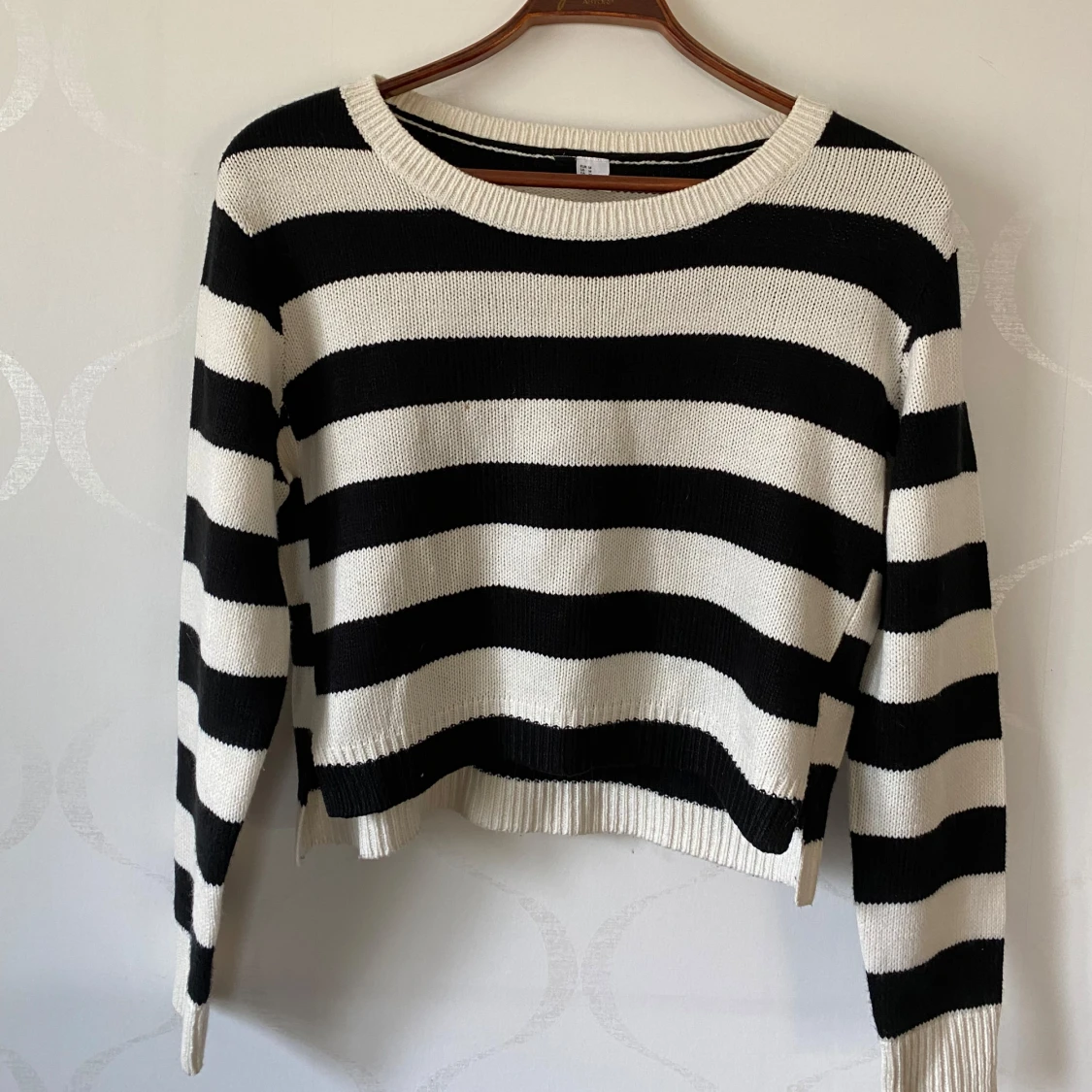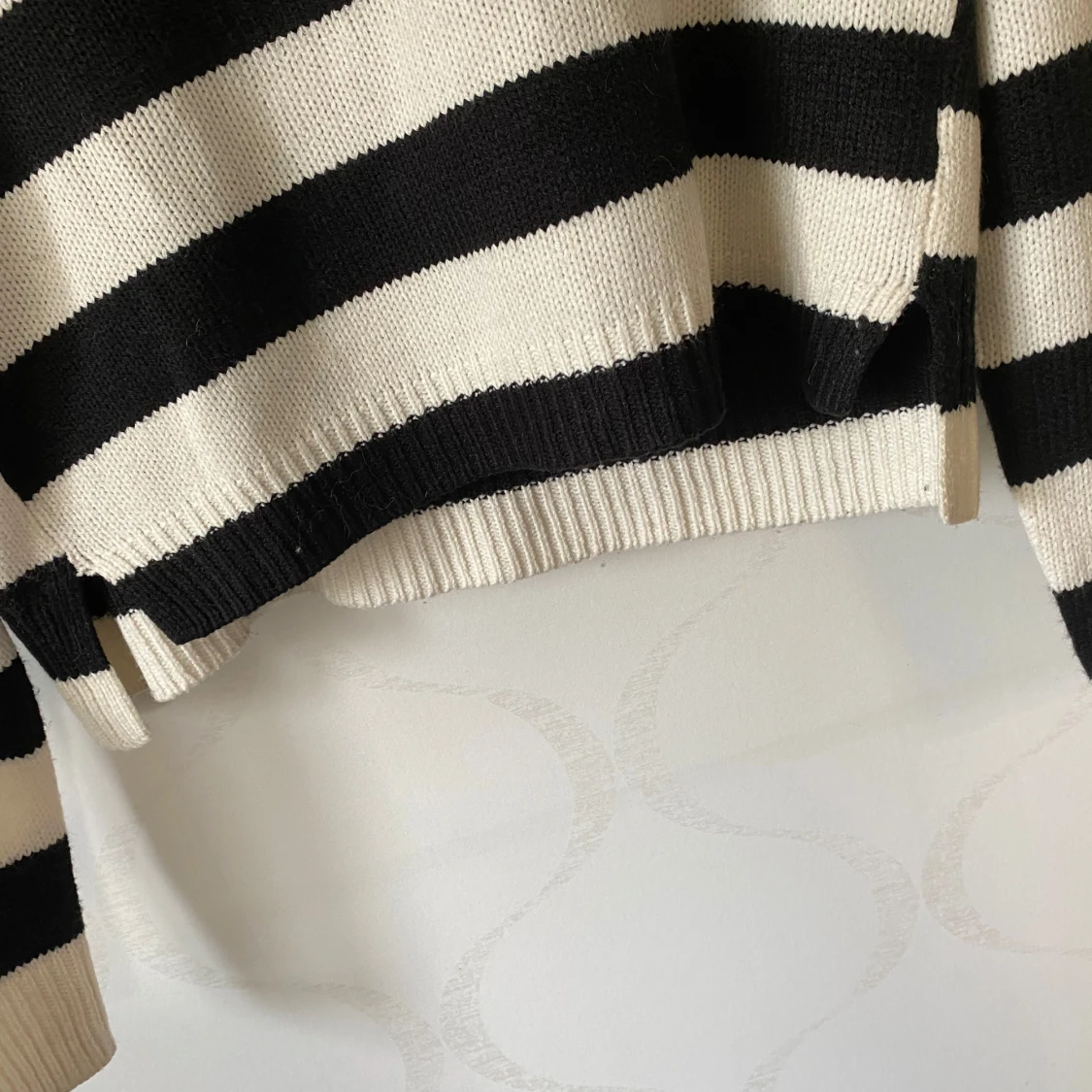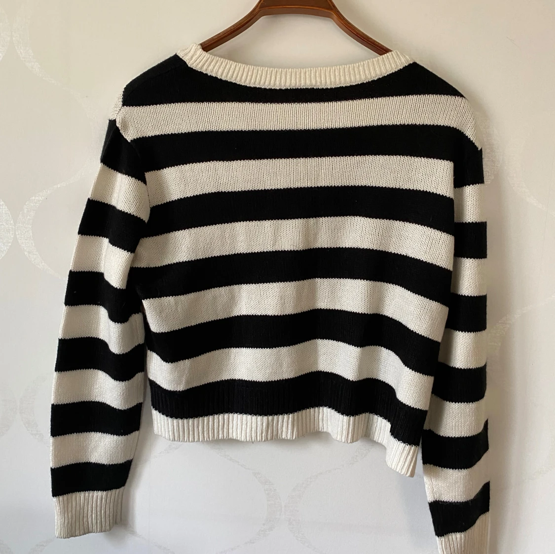 Säljer en snygg svartvit randig stickad tröja med långa ärmar. Tröjan har en croppad passform och ribbade kanter vid ärmslut och nederkant. Perfekt för en stilren look!