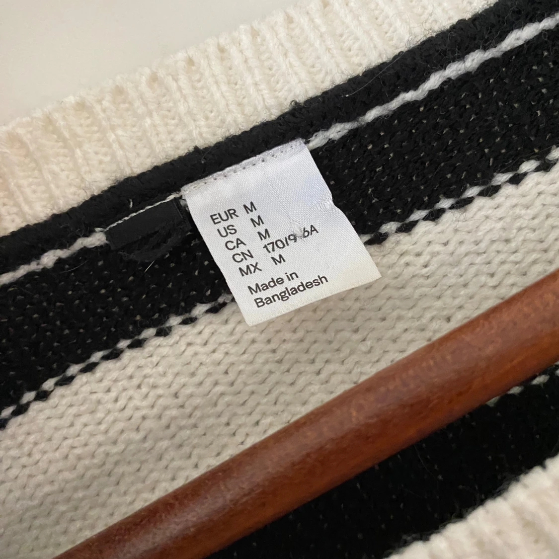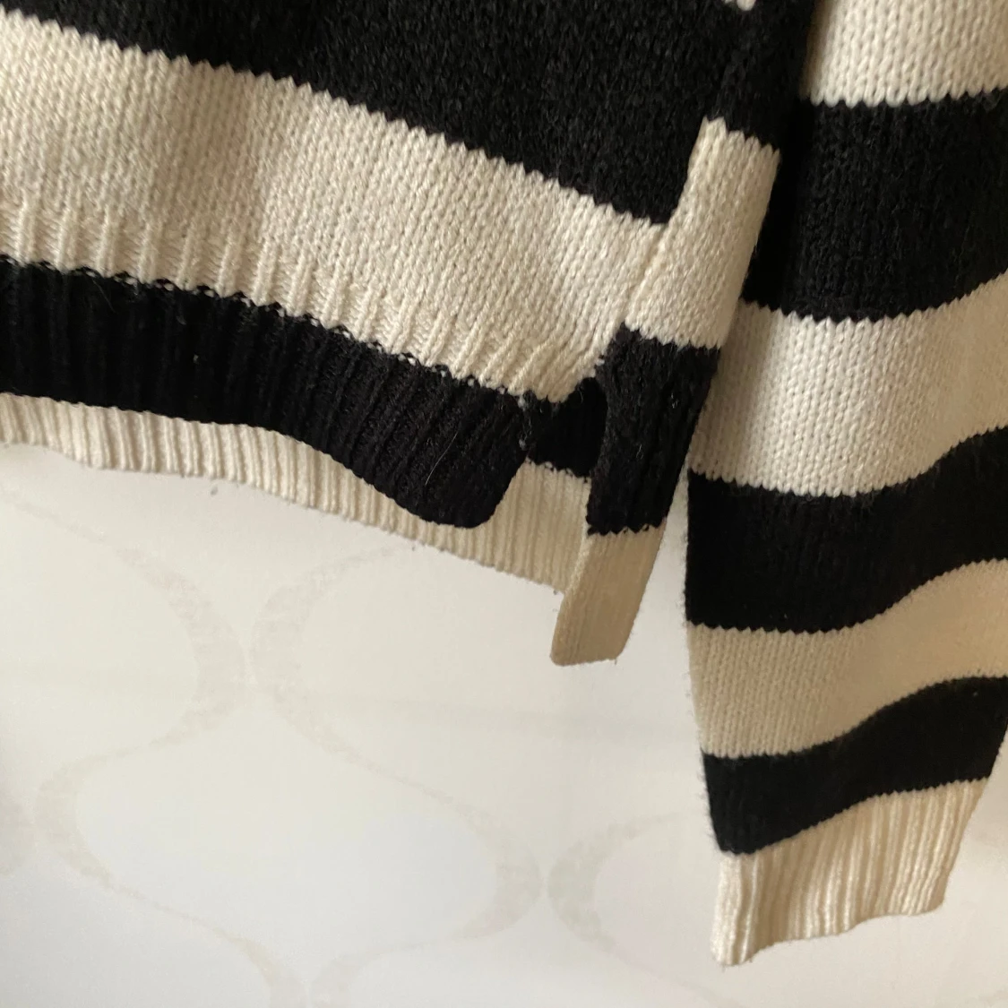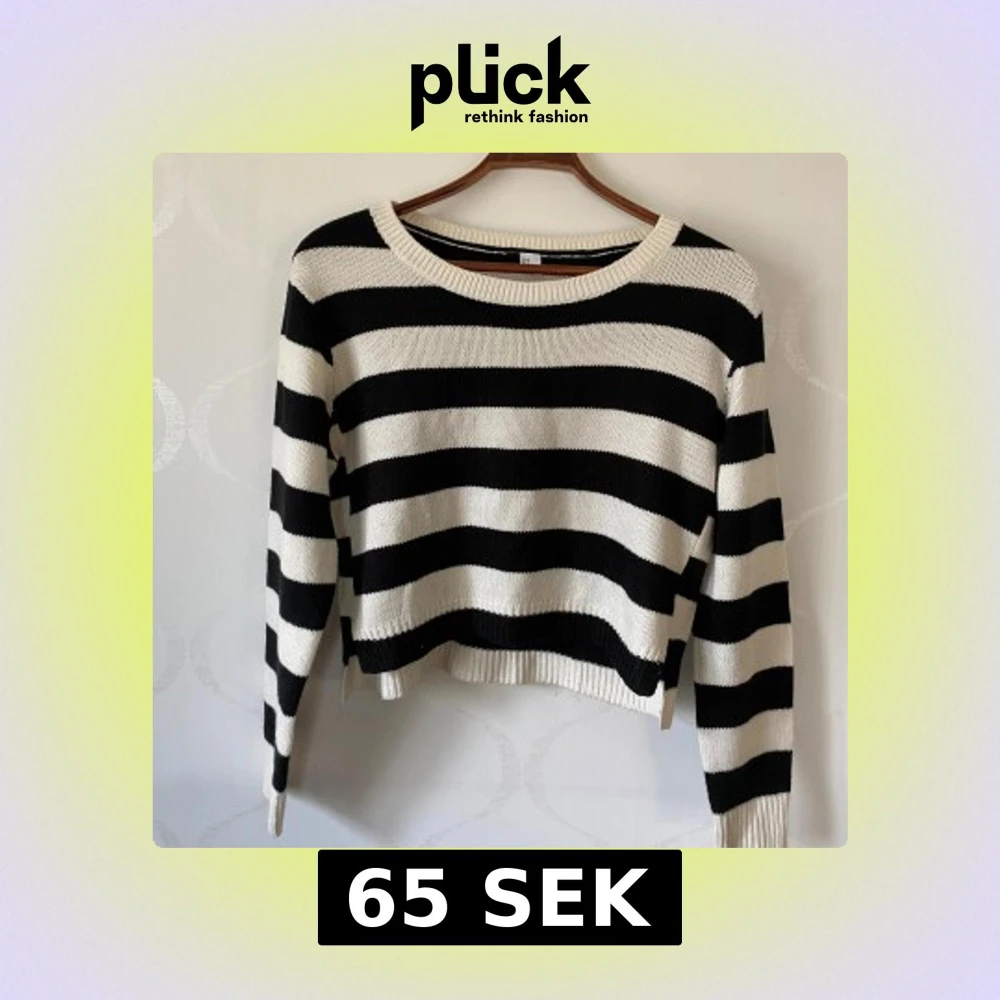 Säljer en snygg svartvit randig stickad tröja med långa ärmar. Tröjan har en croppad passform och ribbade kanter vid ärmslut och nederkant. Perfekt för en stilren look!