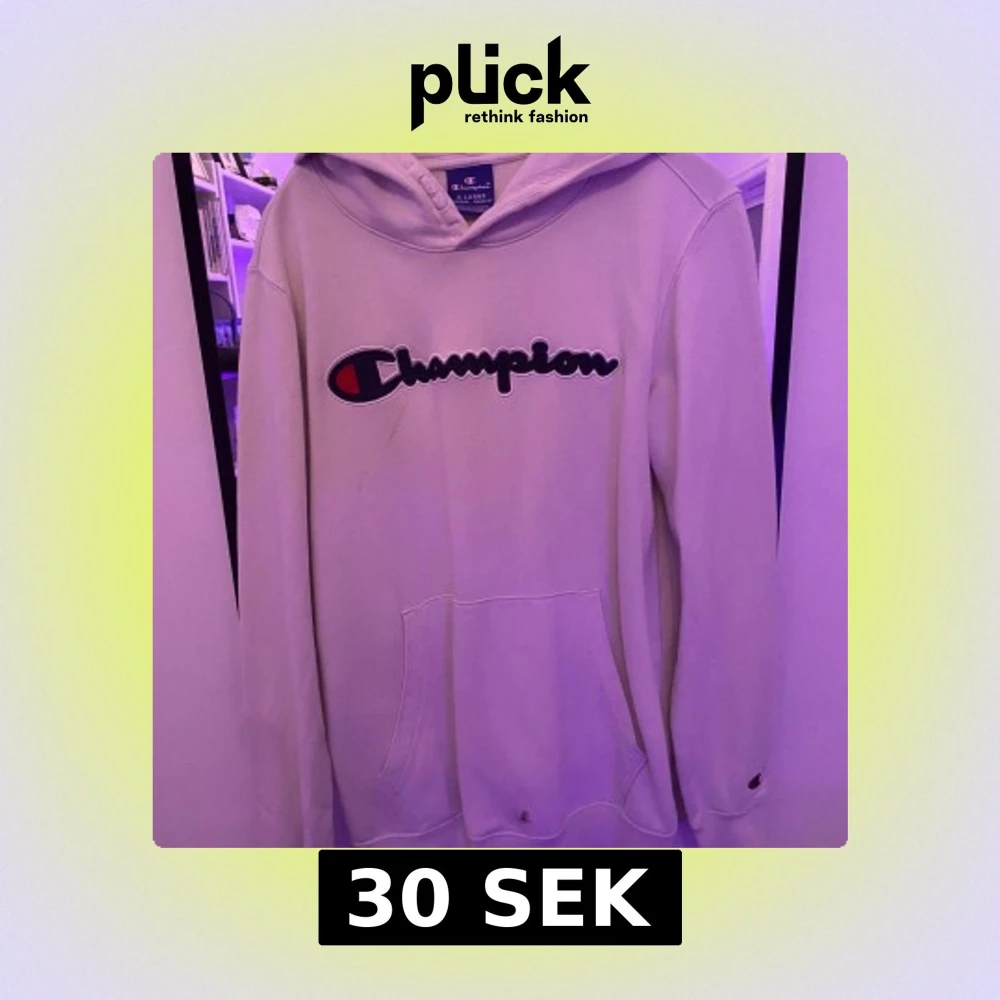 Vit hoodie från Champion i storlek med stort broderat Champion-logo på bröstet. Tröjan har huva med snörning och en klassisk magficka. Långärmad och tillverkad i mjuk bomull, perfekt för chill dagar. Snygg och enkel stil som funkar året runt.
