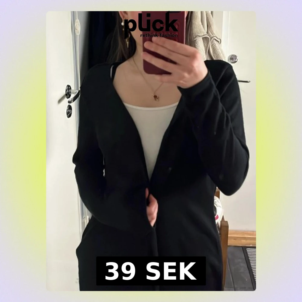 Säljer en svart lång kofta från h&m med enkel design och långa ärmar. Koftan är öppen framtill och gjord i ett mjukt, tunt material. Storlek S