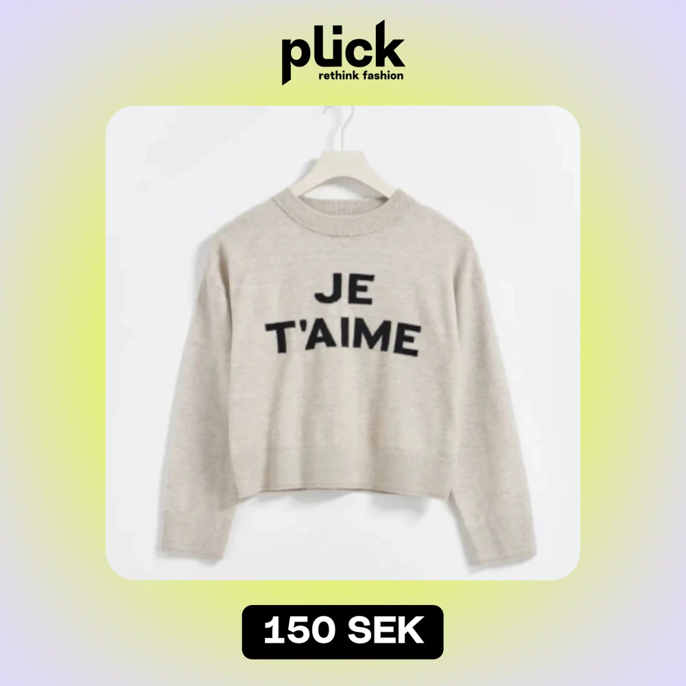 Säljer en superfin beige tröja med texten 'JE T'AIME' i svart på framsidan. Tröjan är croppad och har långa ärmar. Den är gjord av mjukt och skönt material, perfekt för höst och vinter. Passar både till jeans och kjol. Perfekt för en casual look eller en mysig dag hemma. Den är köpt på Gina Tricot för 229 och säljer för 150. 🧡