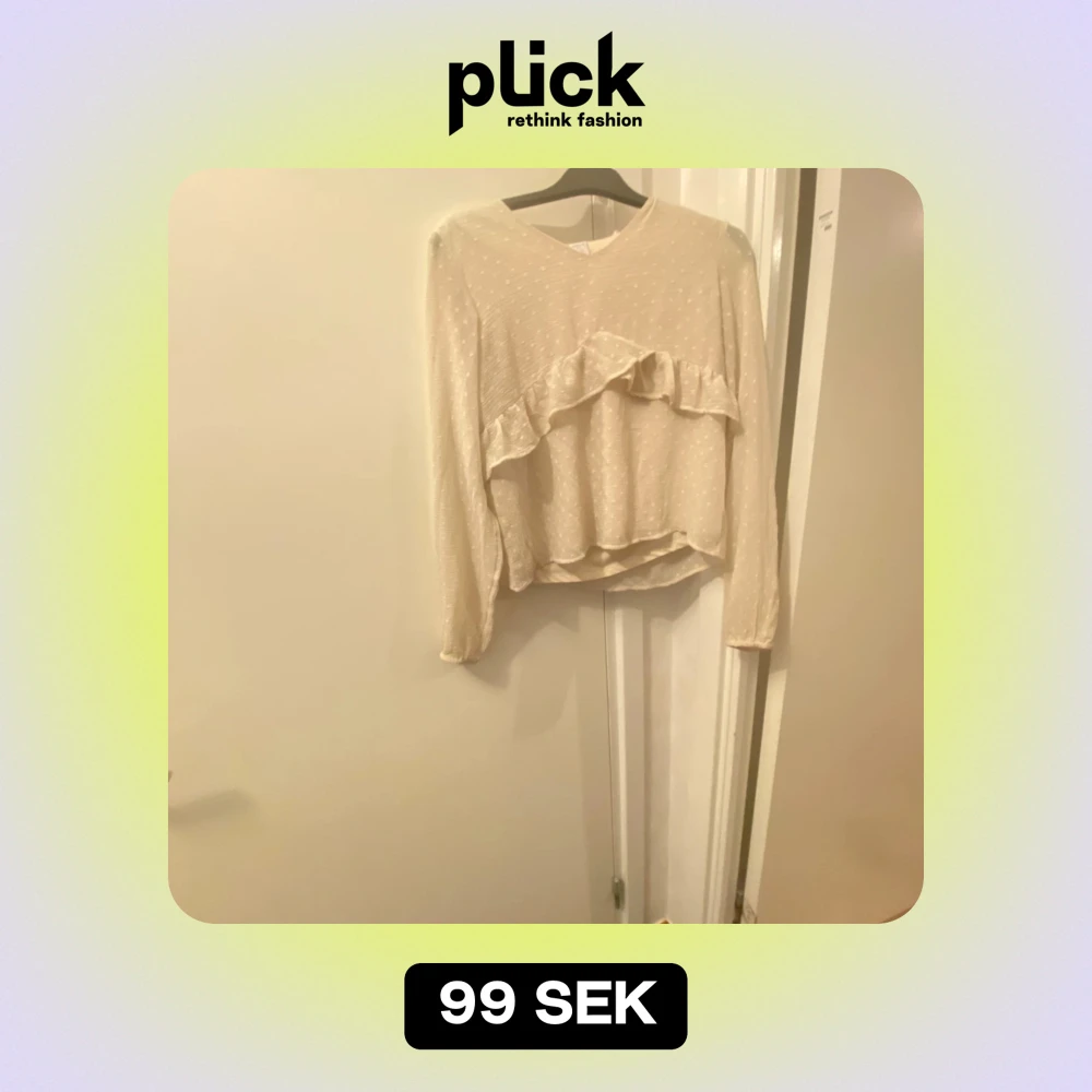 Säljer en söt beige blus med volangdetaljer framtill. Blusen har långa ärmar och en v-ringad hals. Perfekt för både vardag och festliga tillfällen. Passar bra till jeans eller kjol för en chic look!