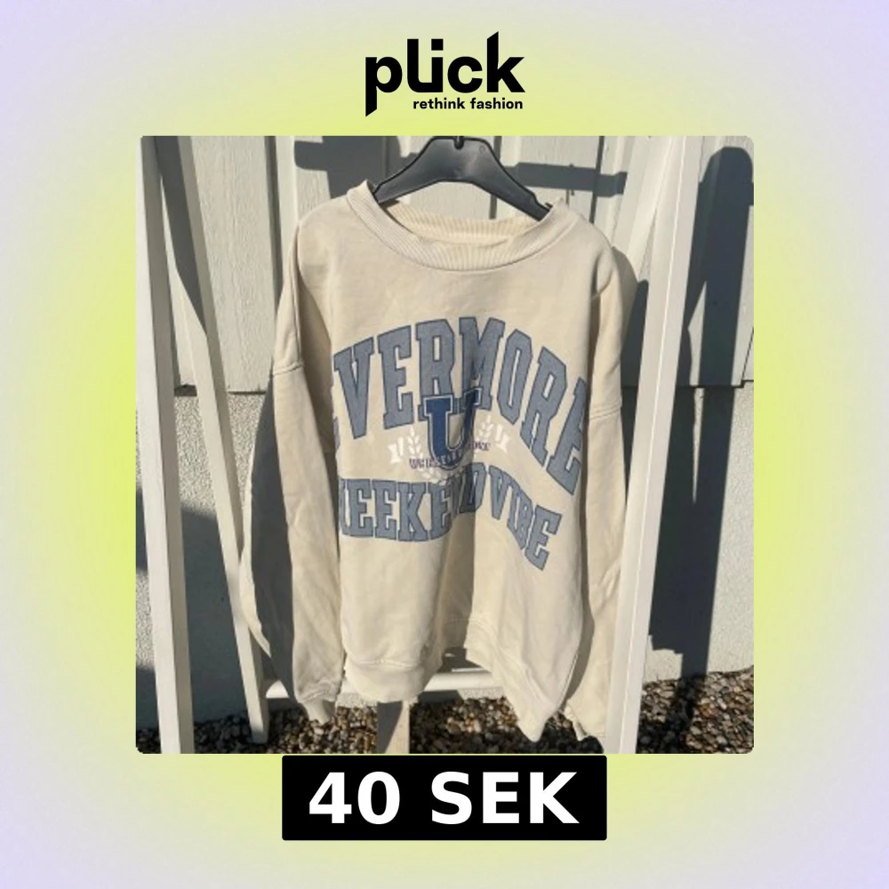 Säljer en beige collegetröja från Lindex med blått tryck på bröstet där det står 'VERMORE WEEKEND VIBE'. Tröjan har rund halsringning och långa ärmar. Perfekt för en avslappnad stil.