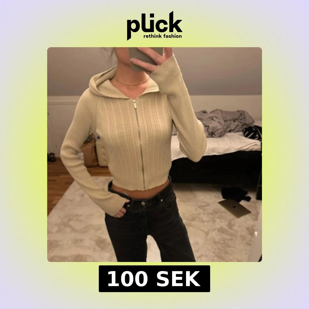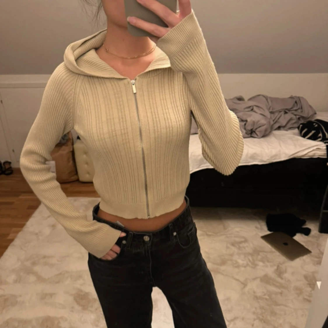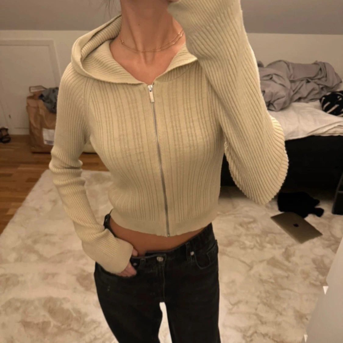Säljer en beige croppad hoodie i ribbstickat material med dragkedja framtill och huva. Supermjuk och skön. använd 1-2 ggr. passar xxs-s.