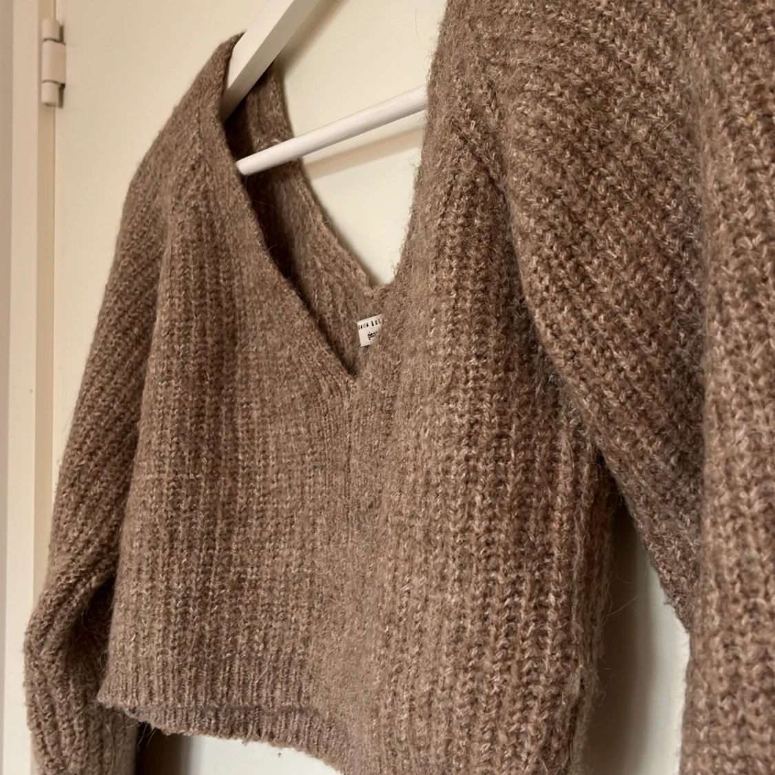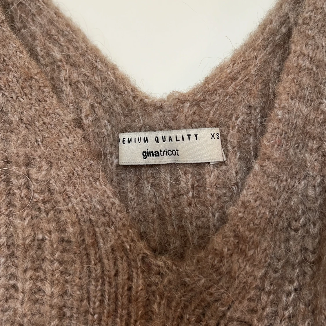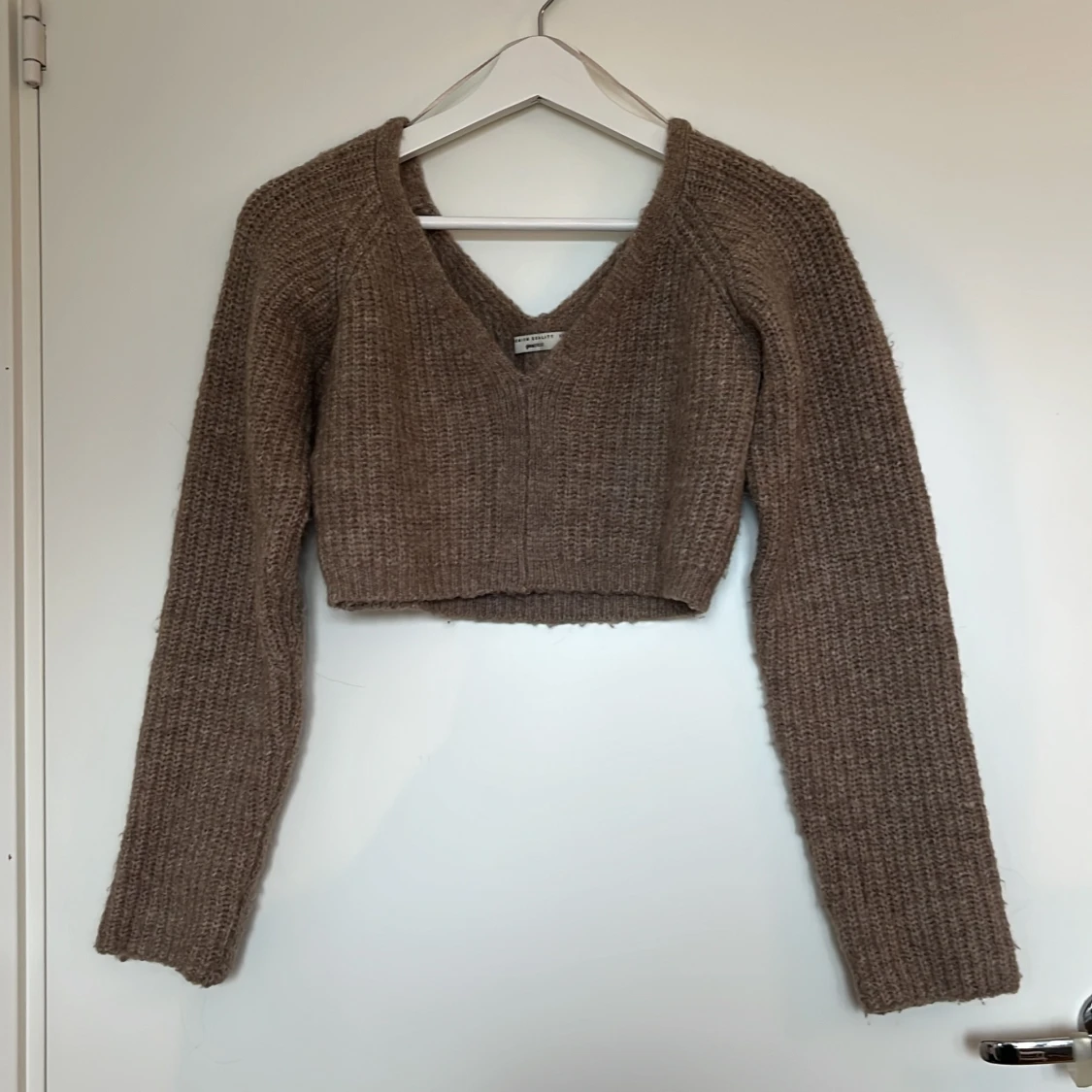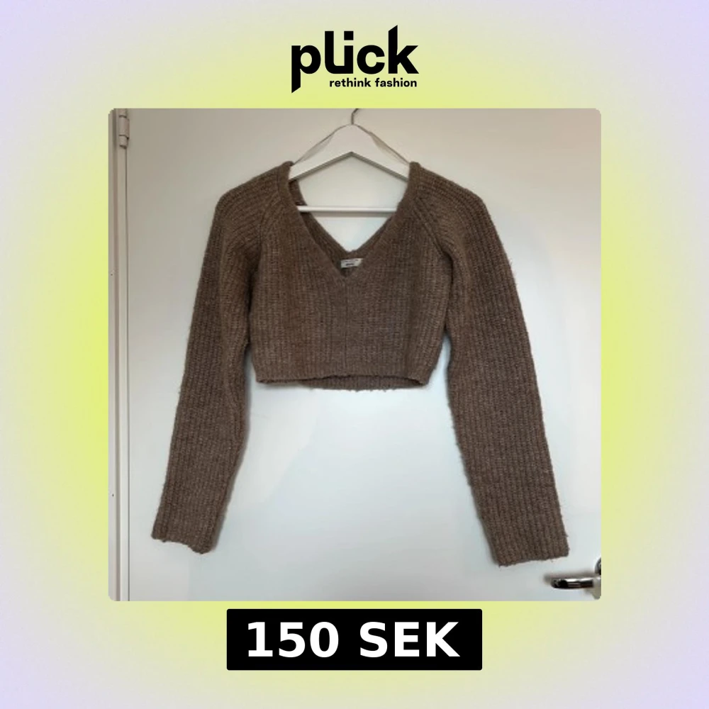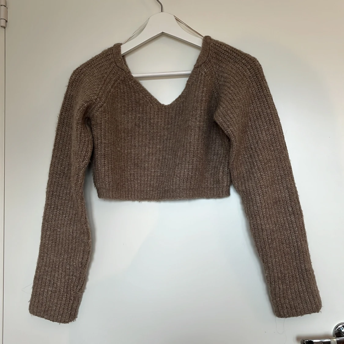 Supermysig croppad stickad tröja från Gina Tricot. Tröjan har v-ringning, lång ärm och ribbad struktur. Från Ginas ’Premium quality’ kollektion. Materialet kan upplevas stickigt mot huden.