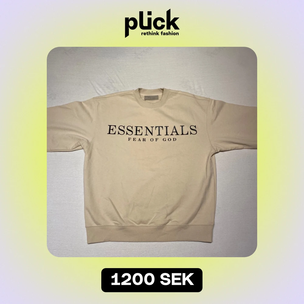 Säljer en snygg beige tröja från Essentials Fear of God. Aldrig använt den därför är den i mycket bra skick och passar perfekt för både höst, vinter och vår. OBS: Är storlek M men passar som L