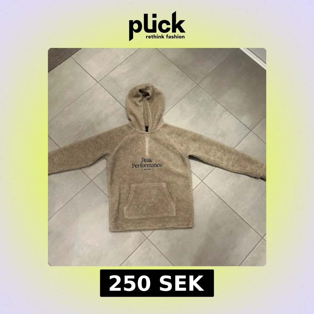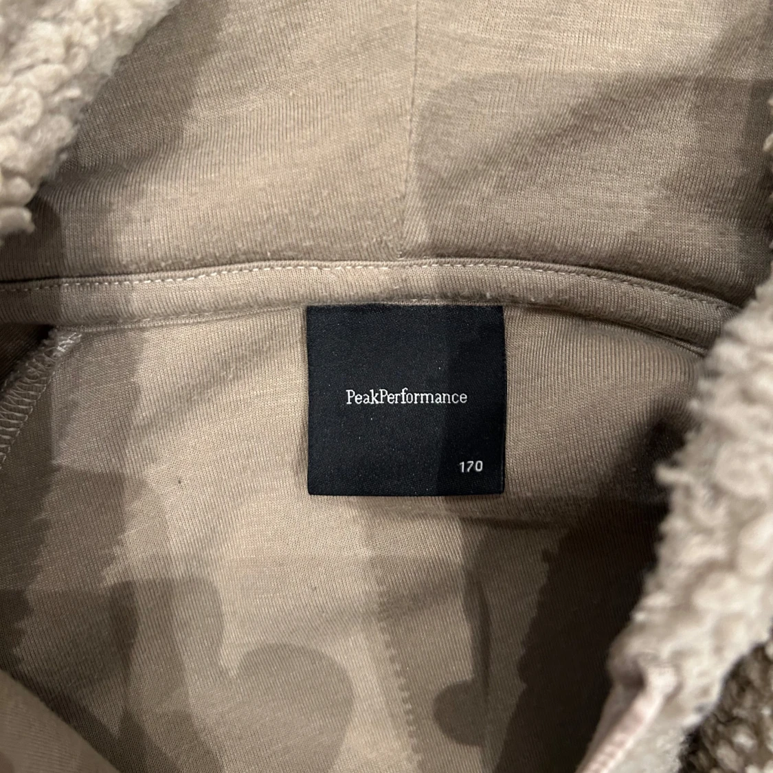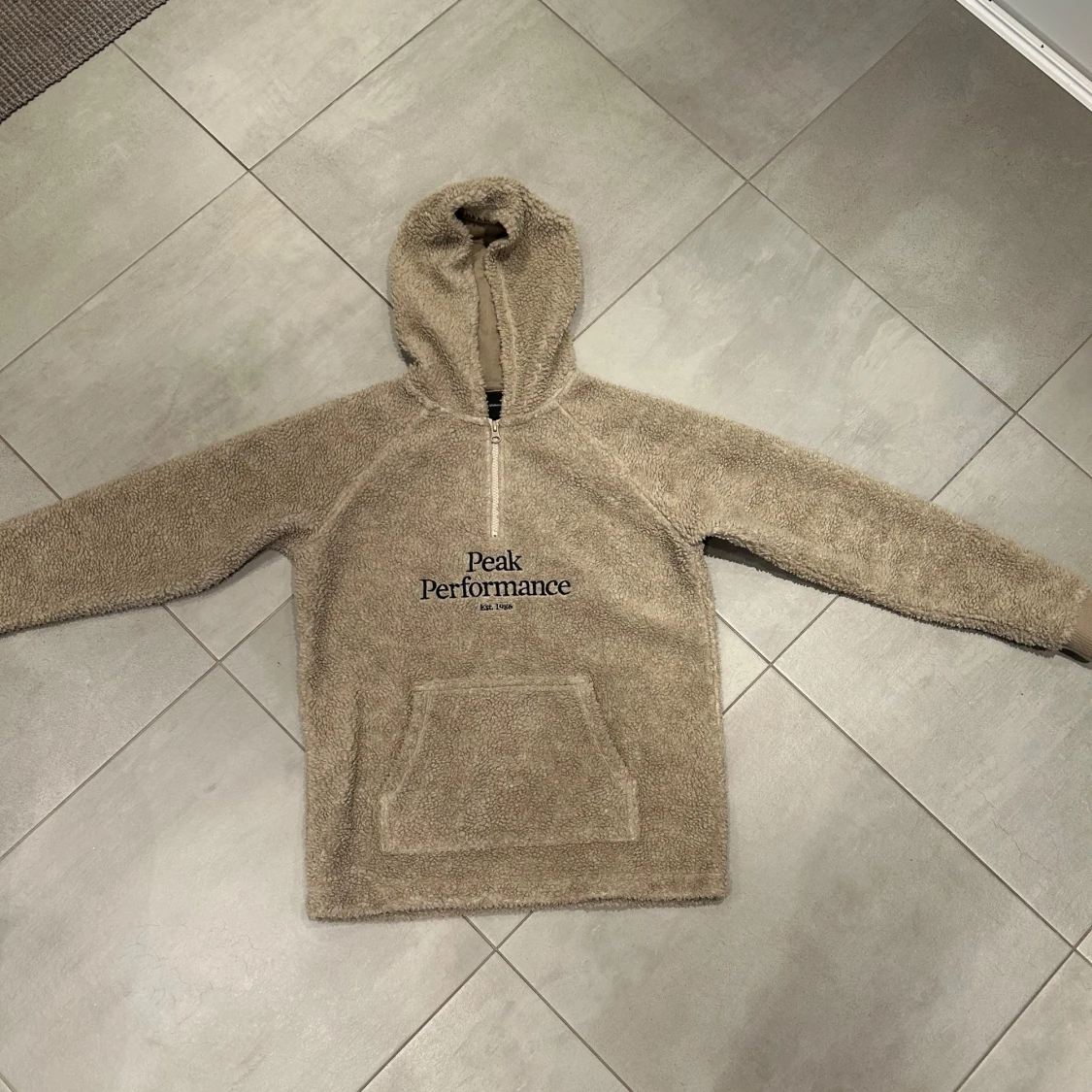 Mysig beige hoodie från Peak Performance i fleece-material. Tröjan har huva, halv dragkedja framtill och en stor magficka. Perfekt för kyliga dagar och enkel att matcha med andra plagg.